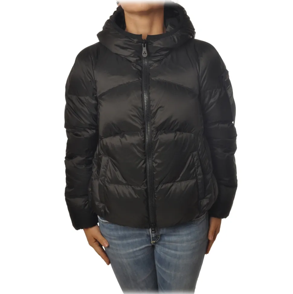 Peuterey jacket, Carena model, short egg-shaped model taken up at the bottom by elastic, with fixed hood, contrasting zip and welt pockets, with quilted fabric, padded with down.