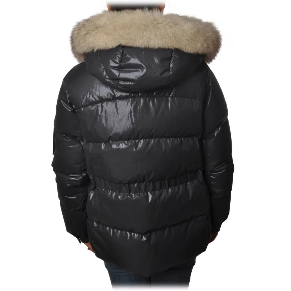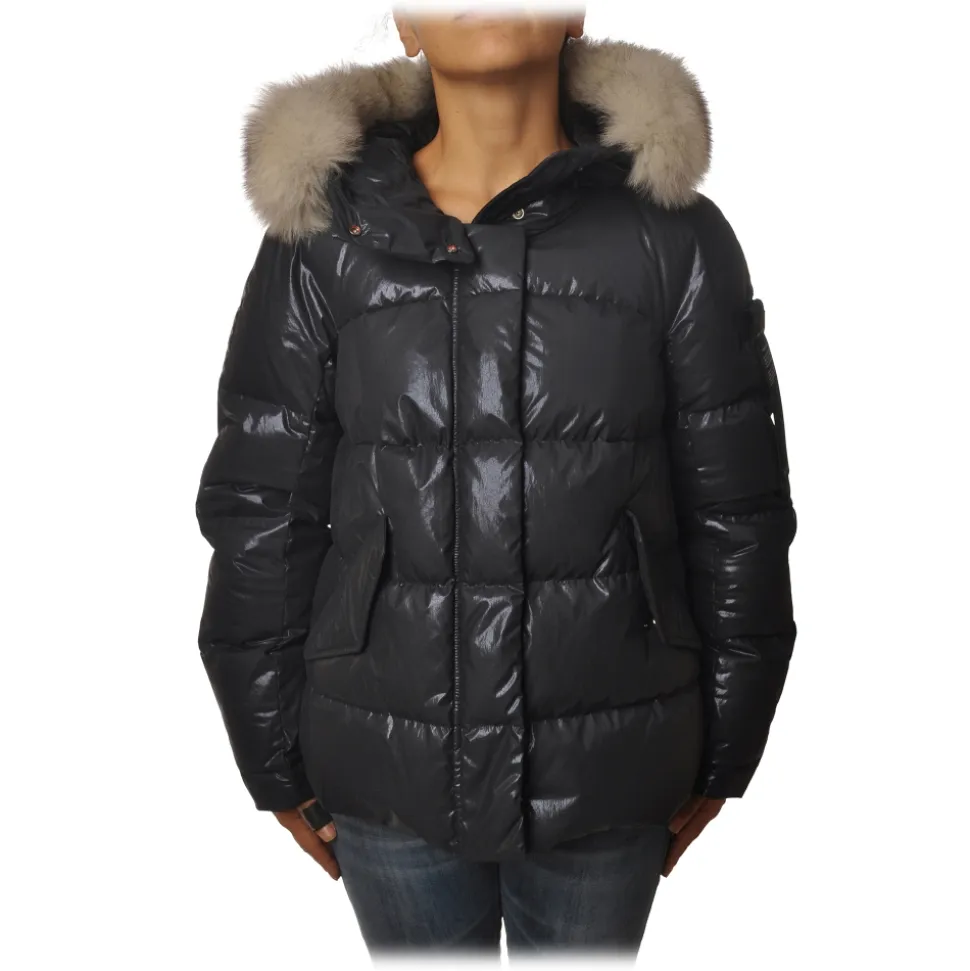 Peuterey jacket, short trapeze model, shiny quilted fabric, with two pockets with oblique flap, with hood finished with removable fur, in contrasting color, feather padding.