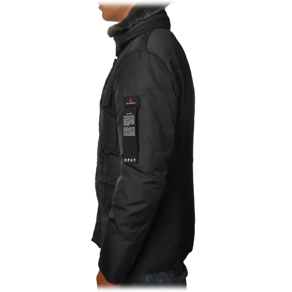 Peuterey jacket, 3/4 long model with drawstring at the waist, four patch pockets, with removable fur collar, shiny water-repellent fabric, feather padding.