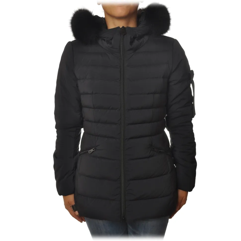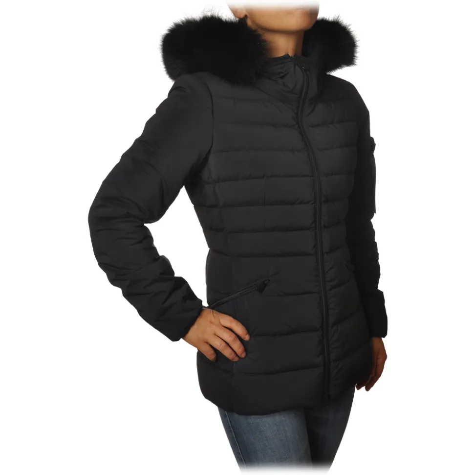 Peuterey jacket, short model with opaque and stitched fabric, with hood finished in removable fur, with zip closure, and two concealed pockets.