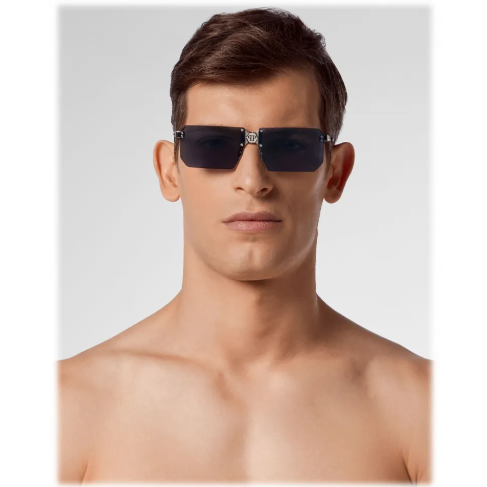 Philipp Plein Combact Collection rectangular sunglasses. Rimless metal frame sunglasses with squared lenses and brand logo.