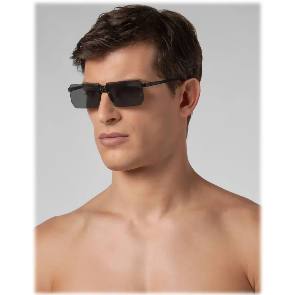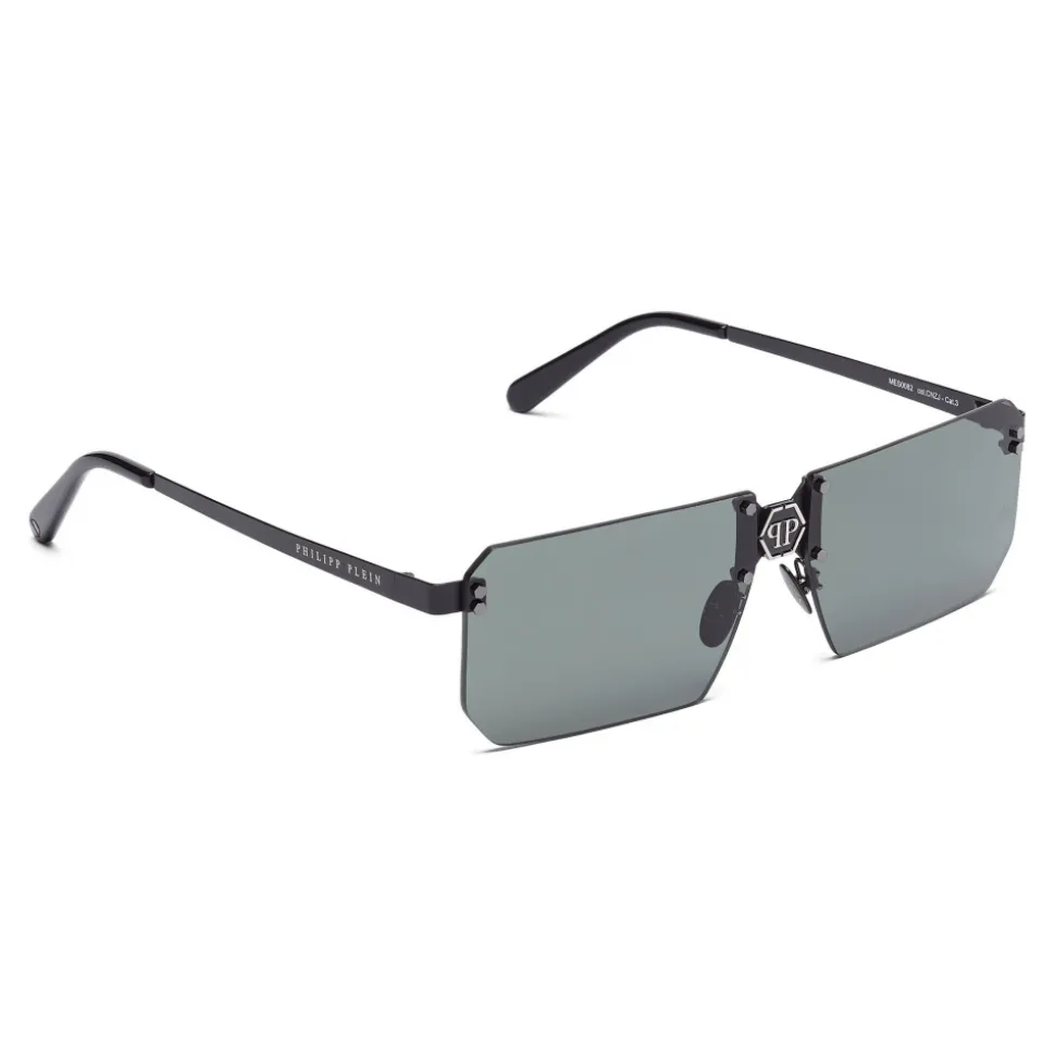 Philipp Plein Combact Collection rectangular sunglasses. Rimless metal frame sunglasses with squared lenses and brand logo.