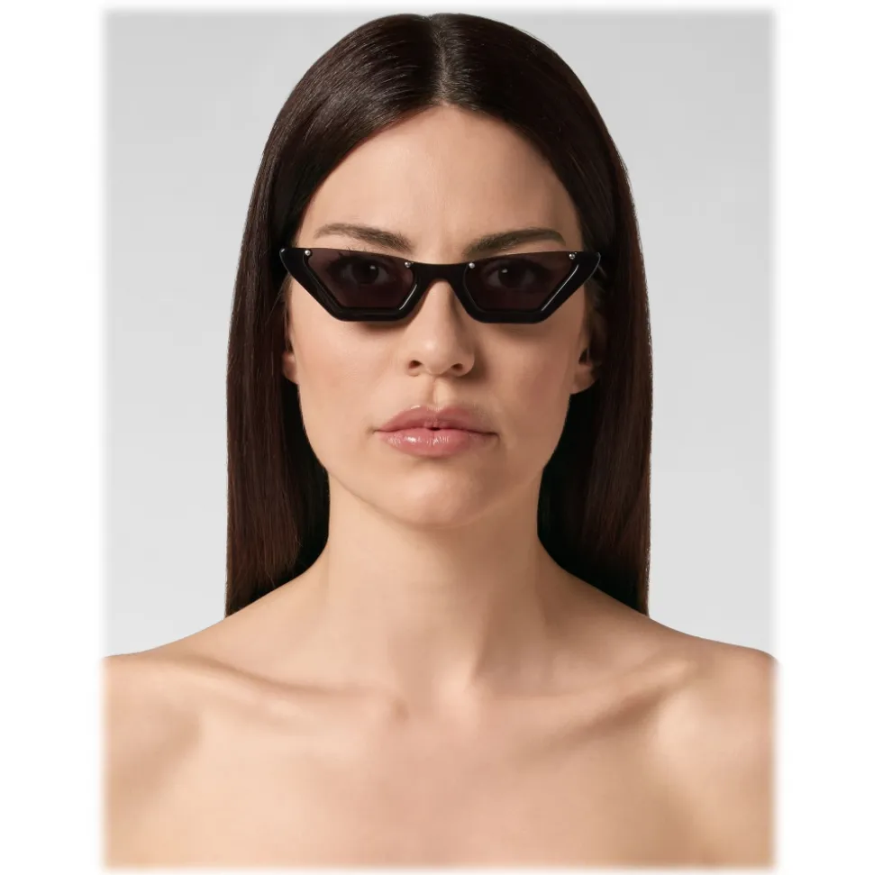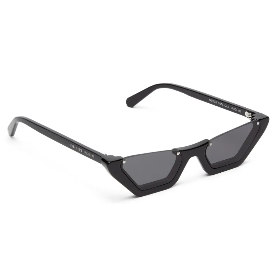 Philipp Plein Rachy Collection sunglasses. Geometrical “Cat Eye” model. Upper rimless acetate frame sunglasses.