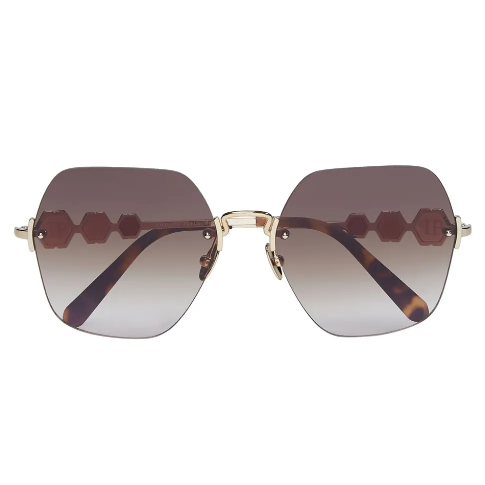 Philipp Plein Statement Edges Collection sunglasses. Rimless metal frame sunglasses with half-squared edges and brand logo aside.