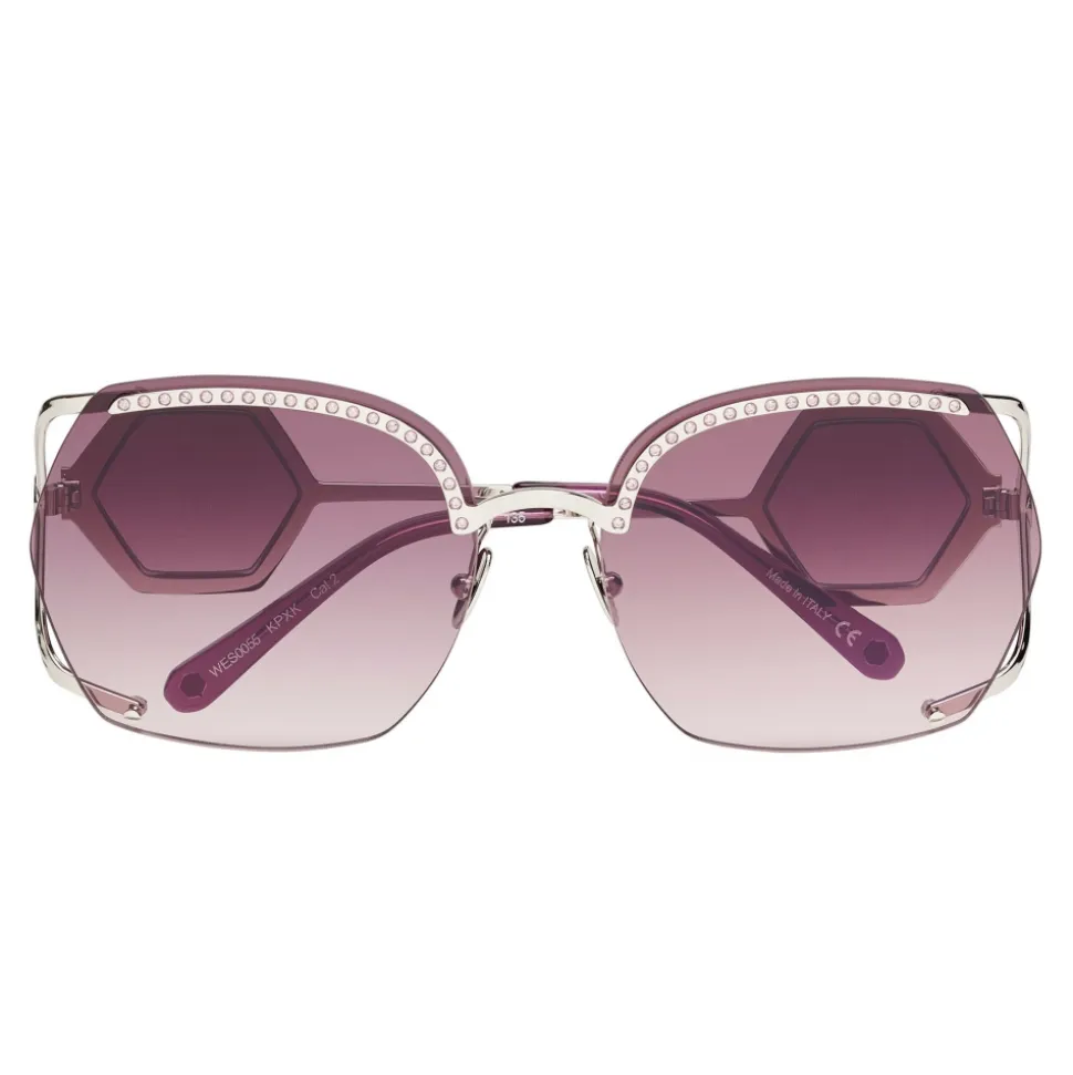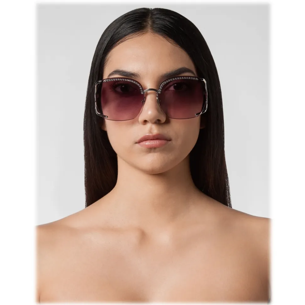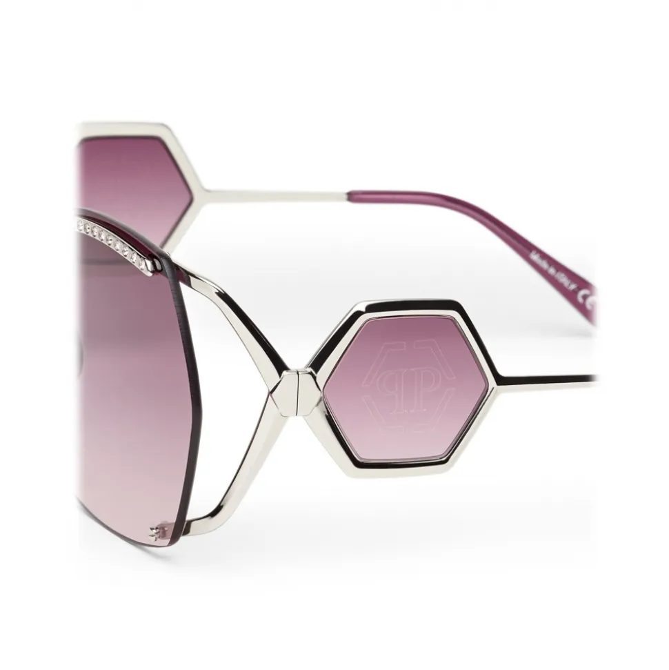 Philipp Plein Statement Oversize Collection sunglasses. Metal frame sunglasses embellished with strass, colored rounded lenses and brand logo aside.