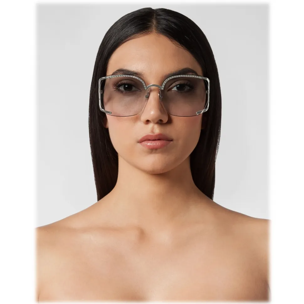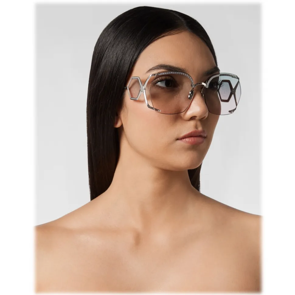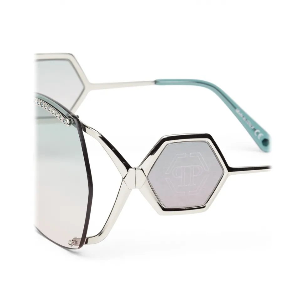 Philipp Plein Statement Oversize Collection sunglasses. Metal frame sunglasses embellished with strass, colored rounded lenses and brand logo aside.
