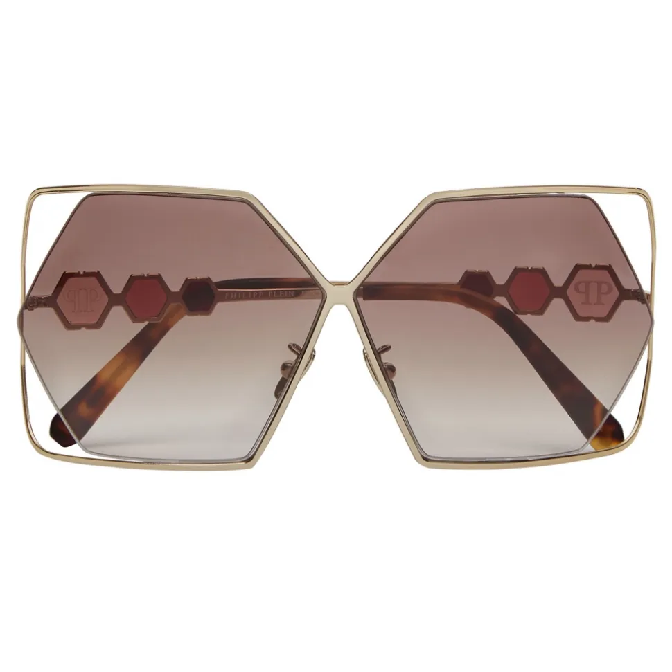 Philipp Plein Tris Collection sunglasses. Metal frame sunglasses with squared edges, colored hexagonal lenses and brand logo aside.
