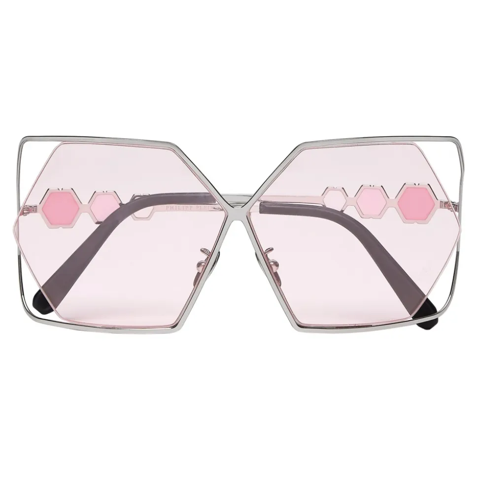 Philipp Plein Tris Collection sunglasses. Metal frame sunglasses with squared edges, colored hexagonal lenses and brand logo aside.