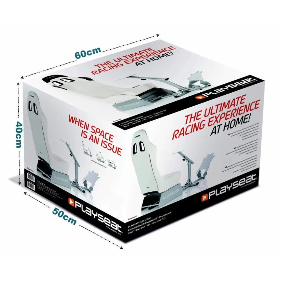 The Evolution White seat has a silver frame and is upholstered with durable white vinyl for many hours of racing! It can be used by adults and children, so all your friends and family members can enjoy this chair. This seat is very comfortable, stable and highly adjustable. Thanks to its unique, patented foldable design, it uses little space when not in use.