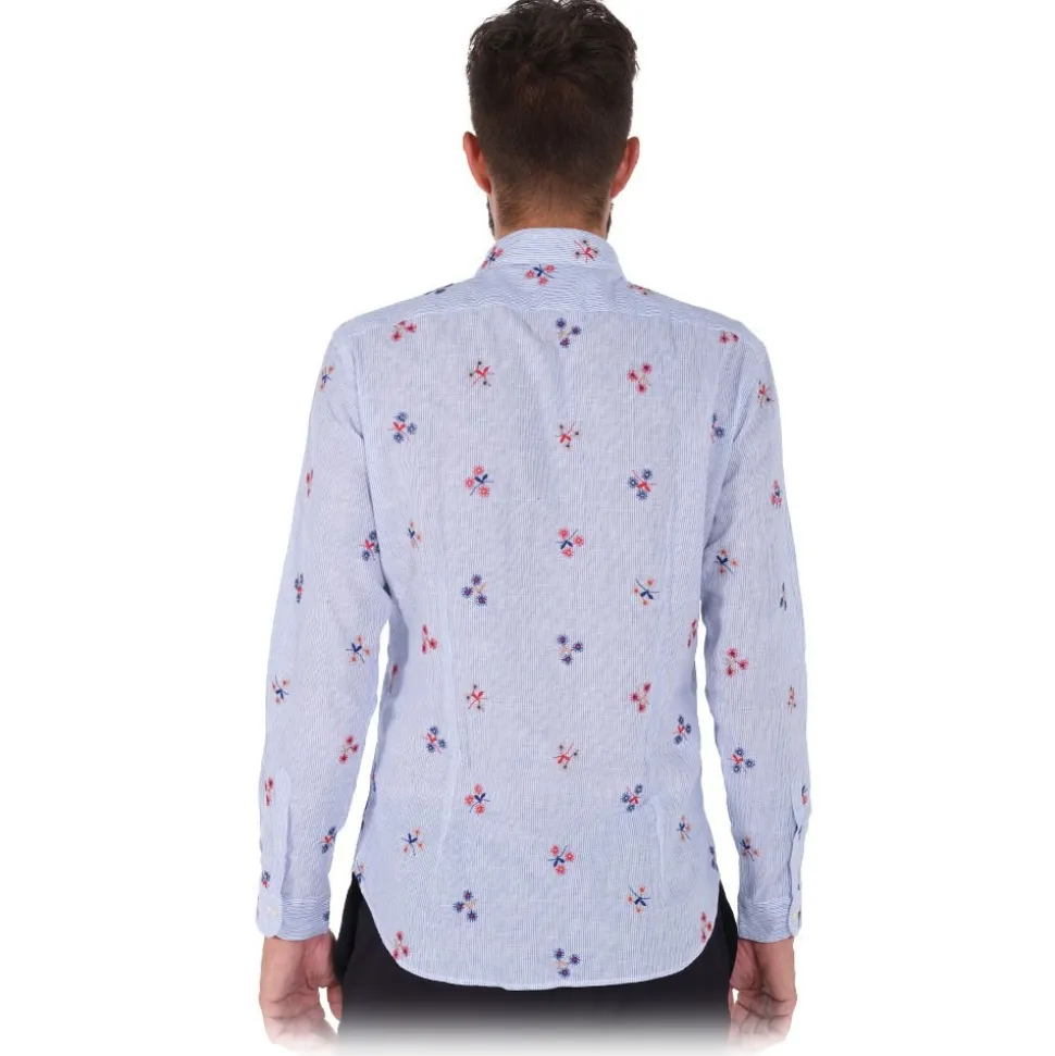 Camicia in lino/cotone con fiori ricamati sulla base bianca con righe blu. Bottoni bianchi in tono alla camicia. Composizione tessuto 55% LINO 45% COTONE – Made in italy.