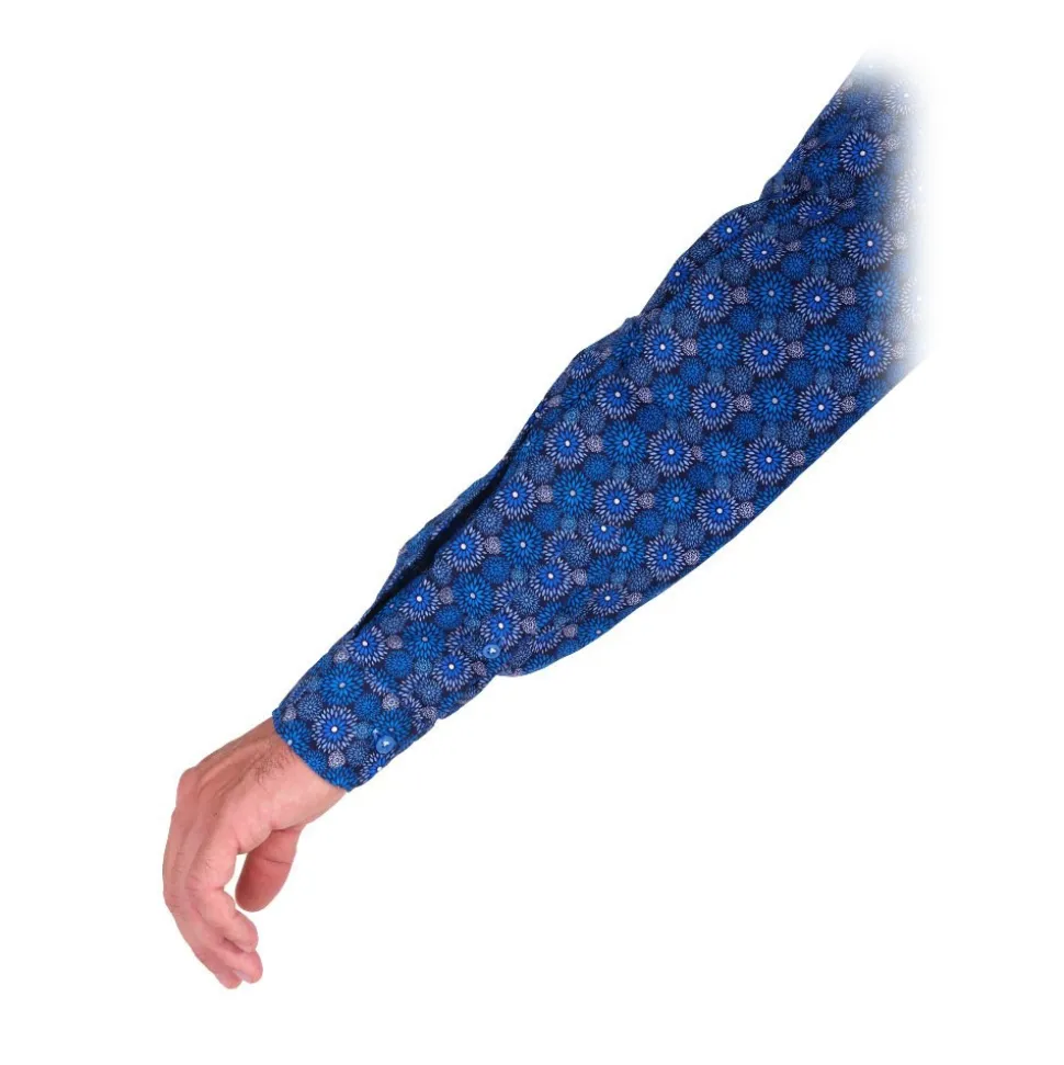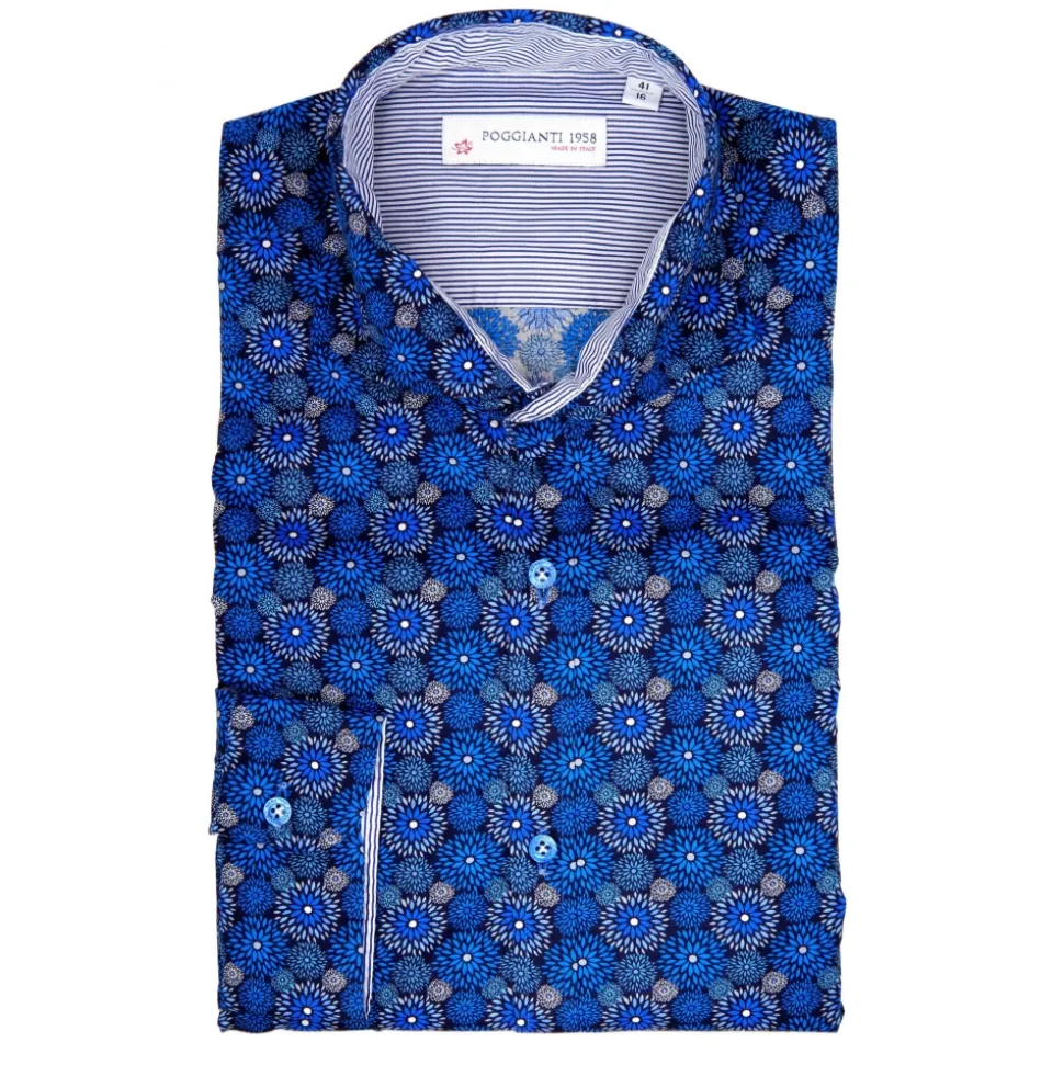 Cotton shirt with floral pattern in shades of blue on a poplin base fabric. White and blue striped fabric as contrast inside shoulder, inside collar and inside cuffs. Tone-on-tone blue buttons. This shirt can be combined with a casual look. Composition 97% COTTON 3% ELASTANE. Made in Italy.
