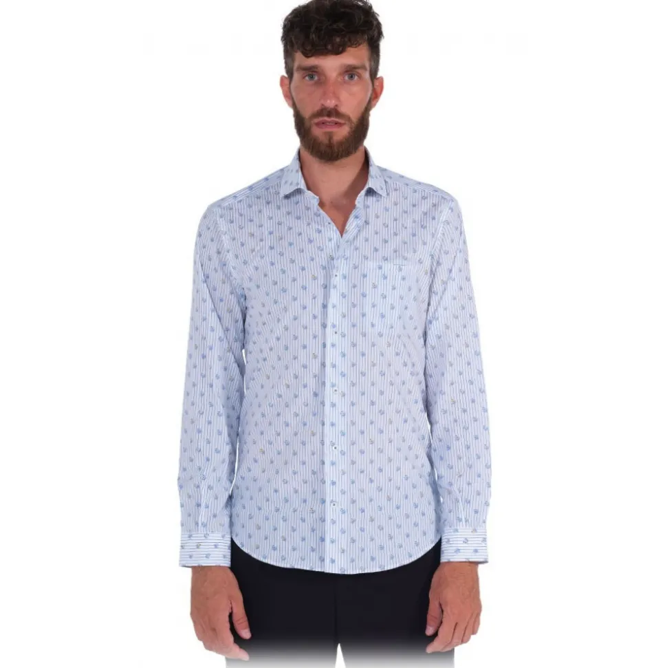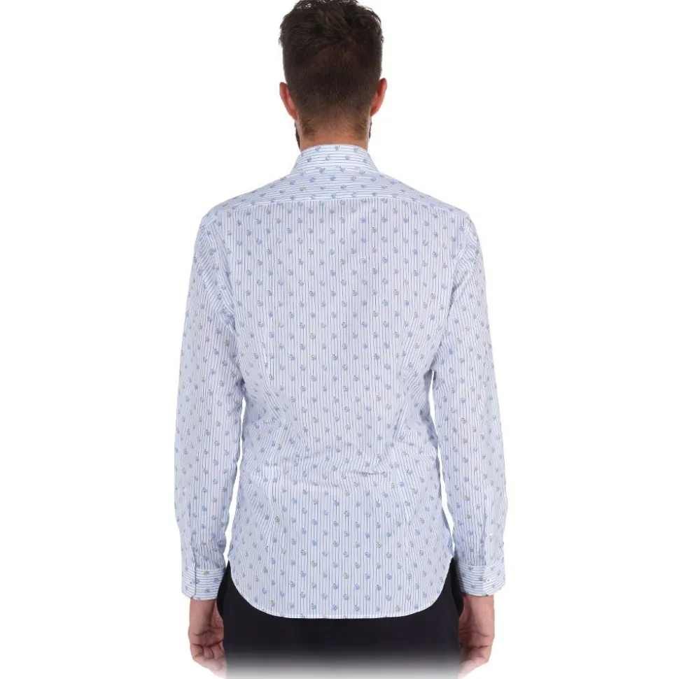 Cotton shirt with blue striped print with dice on a white poplin base. Contrast blue pattern with usual motif, inside pocket, flies on the bottom, under sail collar. White buttons in tone to the shirt .. Fabric composition 100% COTTON – Made in Italy.