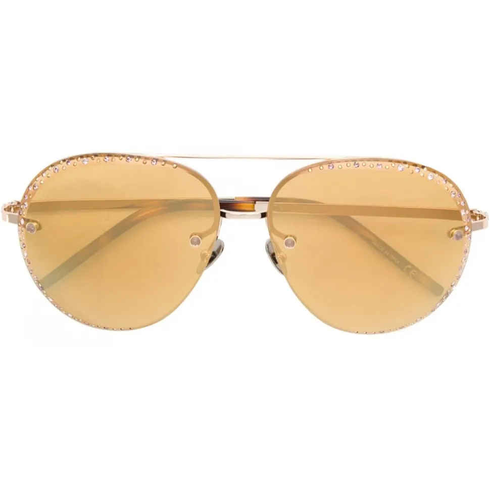 Brown metal cabachon embellished aviators from Pomellato Eyewear featuring a rimless design, aviator frames, gold-tone hardware, a double nose bridge, gold-tone arms, an engraved logo and semi-precious gemstones. This item comes with a protective case.