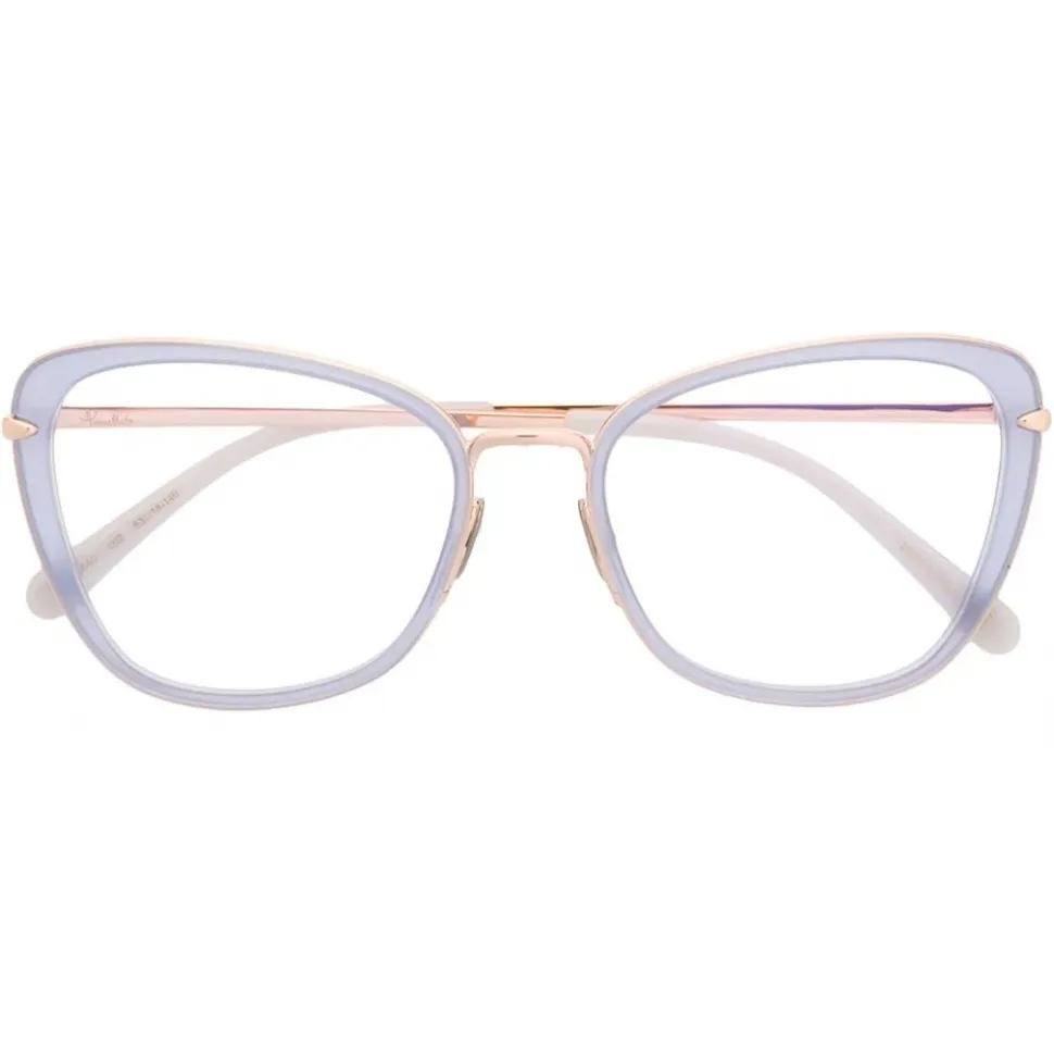 Blue and gold-tone PM0084O glasses from Pomellato Eyewear featuring geometric frames, a logo decal on the lens, nose pads, a logo to the left arm and straight arms with curved tips.