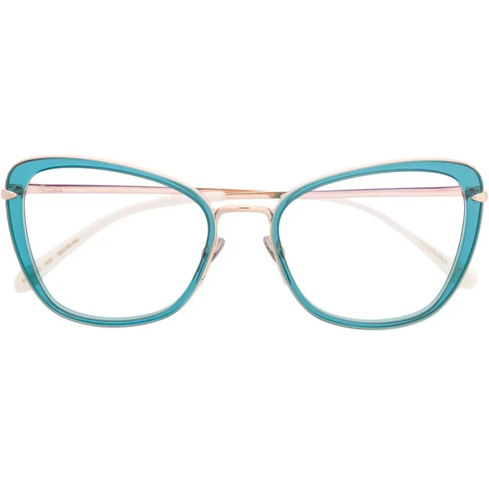 Blue unisex butterfly frame optical glasses from Pomellato Eyewear featuring oversized frames, a logo decal on the lens, a transparent design, nose pads and straight arms with angled tips. These glasses can be adapted to fit all types of prescription lenses.