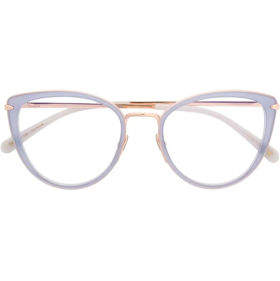 Blue unisex butterfly frame optical glasses from Pomellato Eyewear featuring oversized frames, a logo decal on the lens, nose pads, straight arms with angled tips and a gold-tone finish. These glasses can be adapted to fit all types of prescription lenses.
