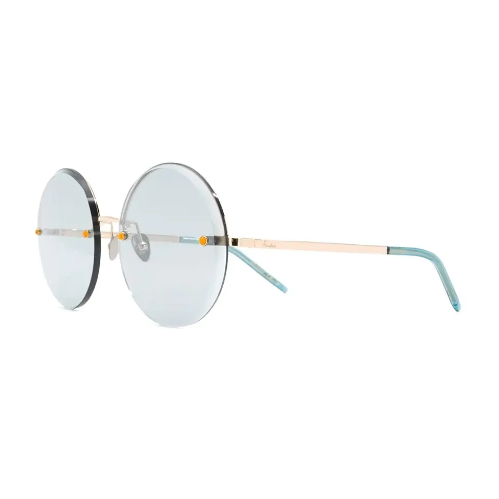 Gold metal crystal embellished round sunglasses from Pomellato Eyewear featuring a rimless design, round frames, crystal embellishments, gold-tone arms and an engraved logo. This item comes with a protective case.