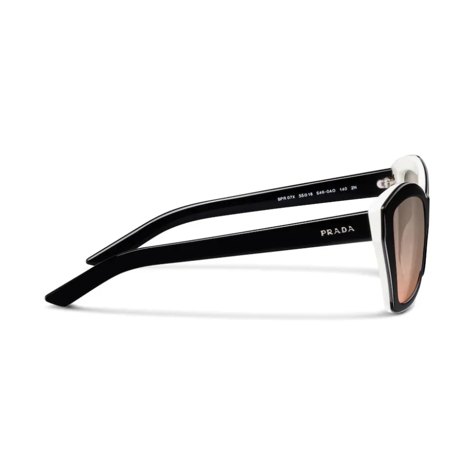 Prada Disguise sunglasses characterized by a sophisticated cat-eye design and bold lines. The frame comes in an exclusive palette of colors with temples defined by graphic motifs printed on the inner side.