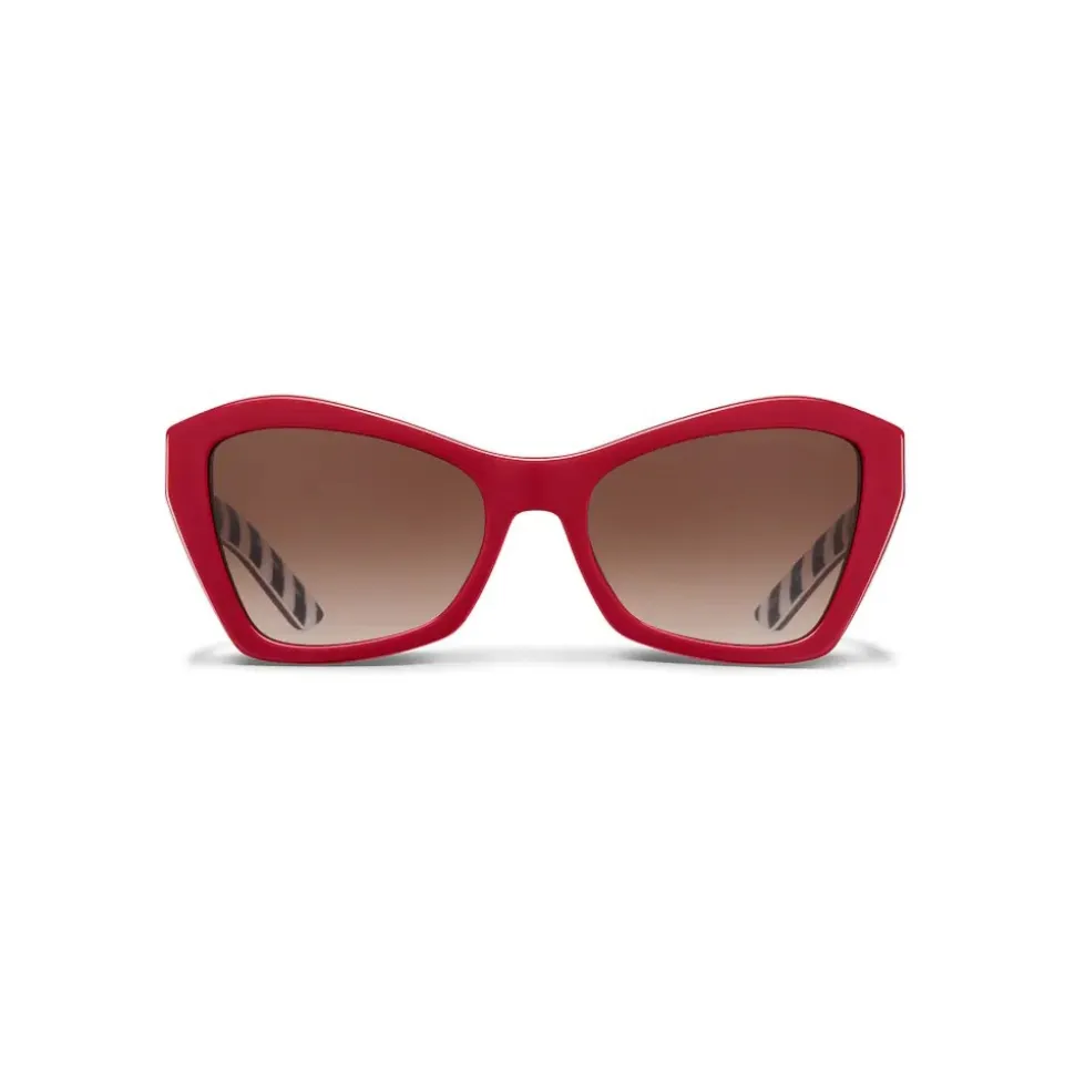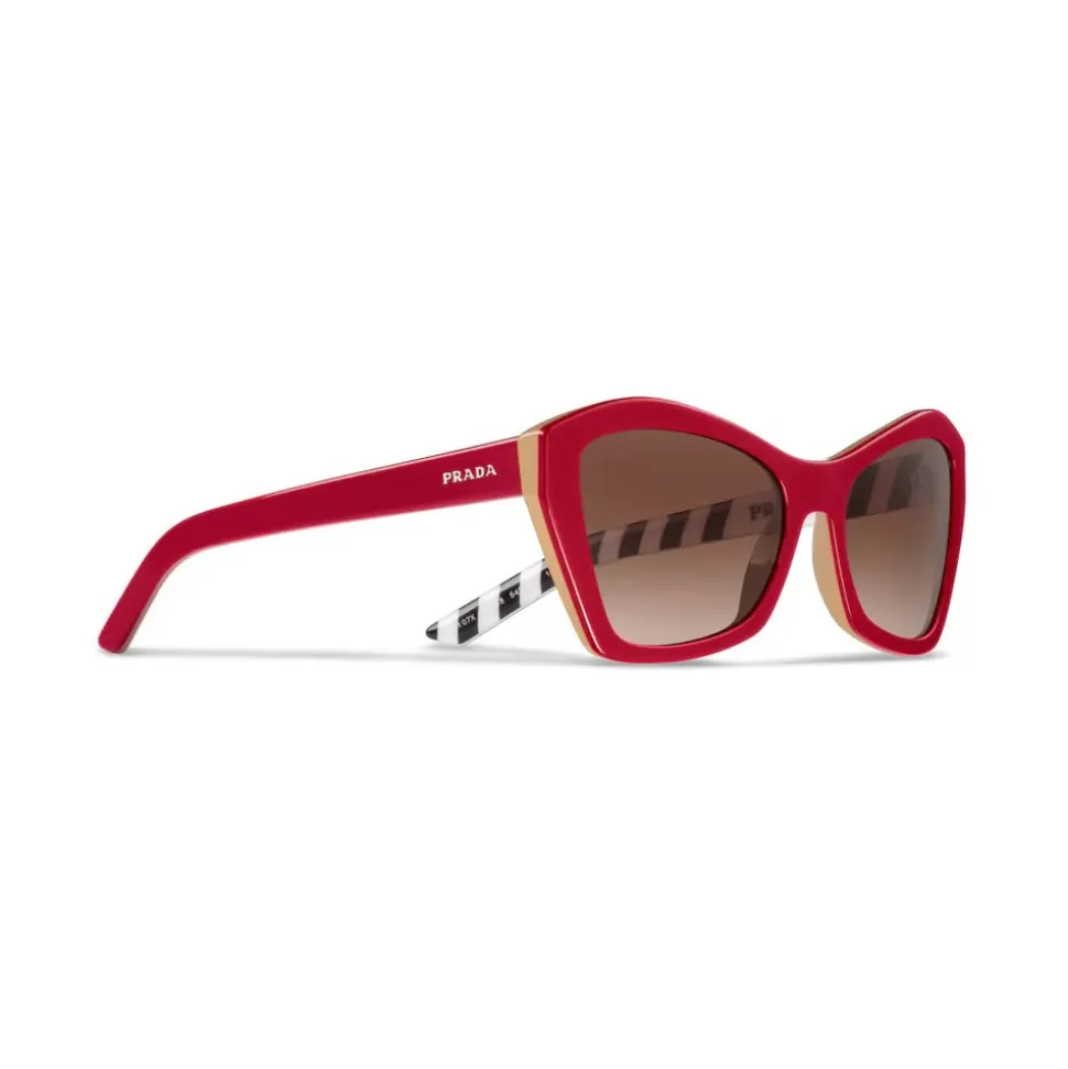Prada Disguise sunglasses characterized by a sophisticated cat-eye design and bold lines. The frame comes in an exclusive palette of colors with temples defined by graphic motifs printed on the inner side.