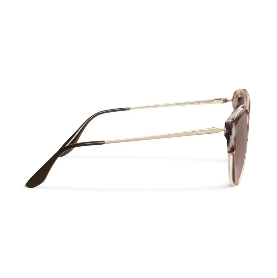 Oversized gently rounded women’s acetate frames. The frame front features a distinctive shiny metal insert that enhances the sophisticated design. Engraved Prada lettering logo.
