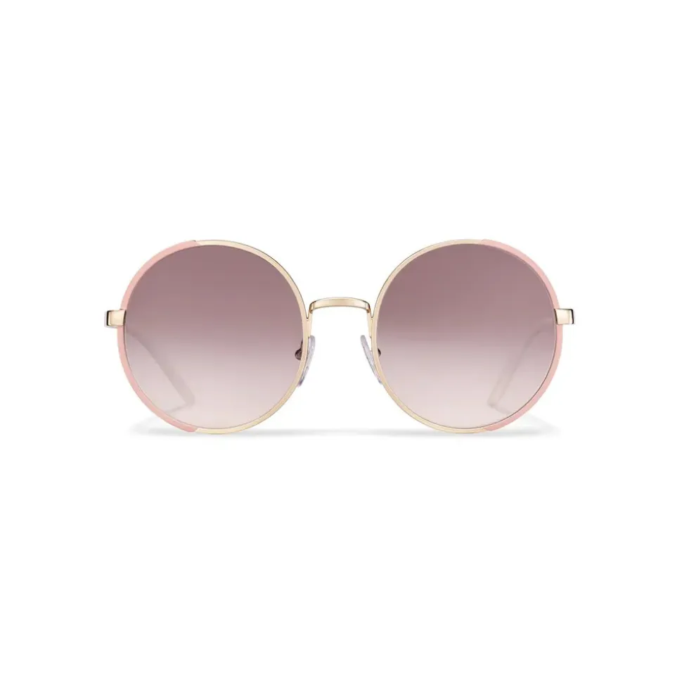 Oversized sunglasses with glamorous contemporary allure. The round frame front is accented with exclusive enamel trim on the metal rims. Prada lettering logo.