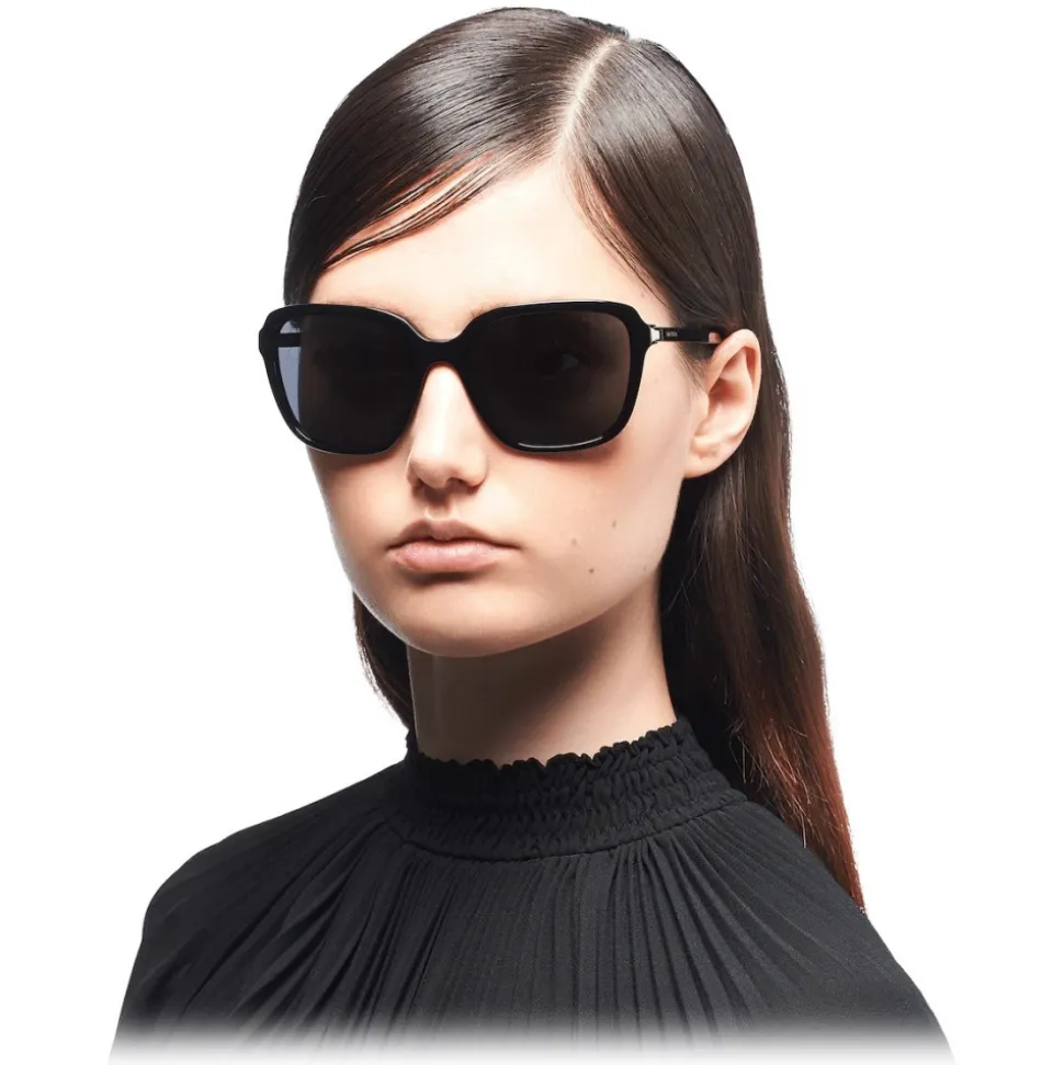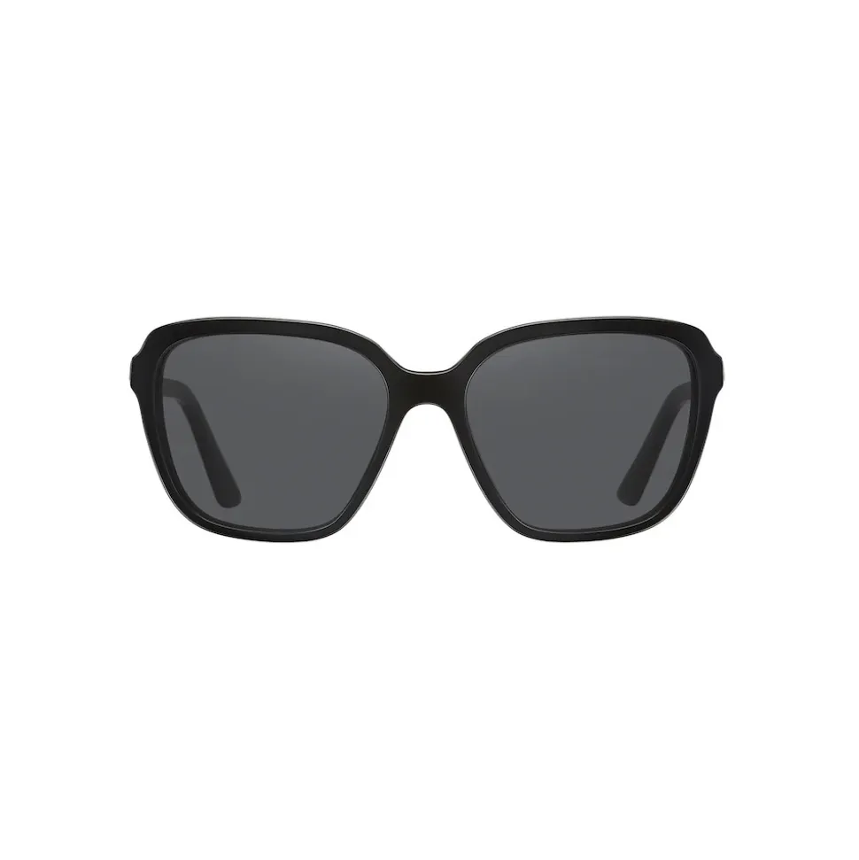 This eyewear with timeless elegance features a slightly curved large square frame front with refined metal inserts on the temples. Prada lettering logo.
