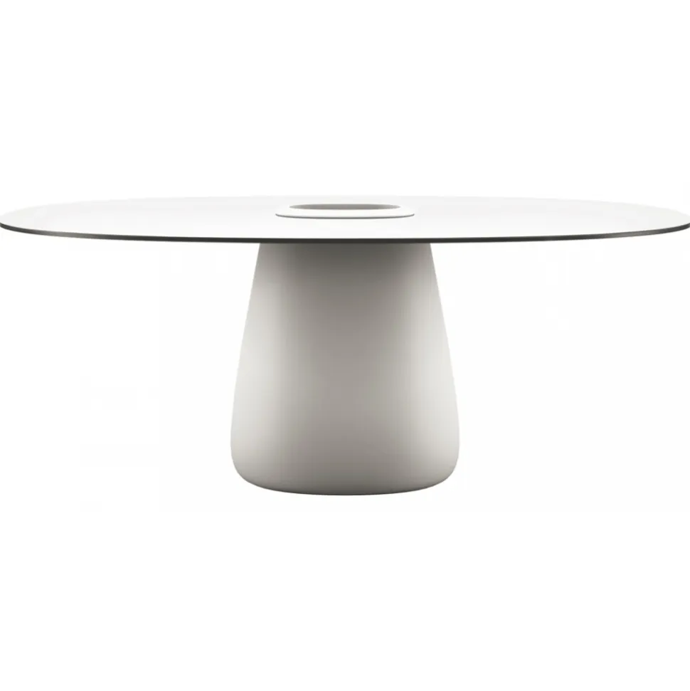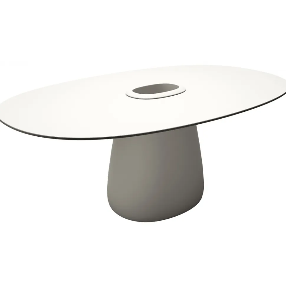 The Cobble Table designed by Elisa Giovannoni is characterised by a central base where you can insert a bucket containing plants or ice to keep bottles fresh. The thin table top is provided in materials suitable for outdoor or indoor use as hpl (full colour or black stratified) in different colors. Available with 190cm diameter top.