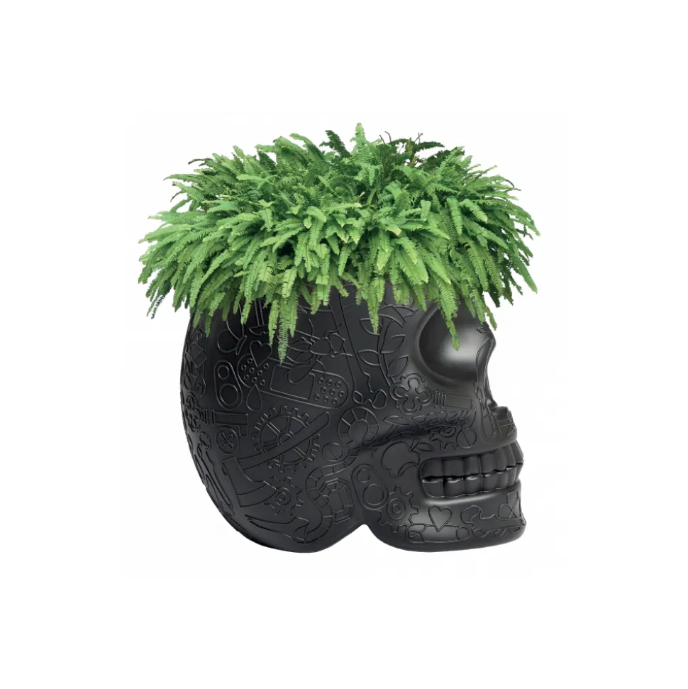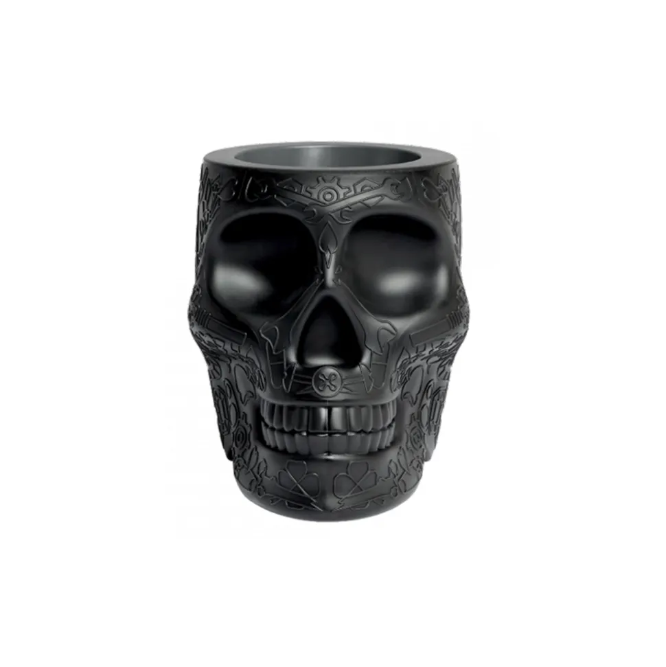 Decorated with the graphic pattern of the Mexican skull, a symbol born to exorcize death and celebrate life, it becomes an ironic champagne cooler or housing for plants and flowers.