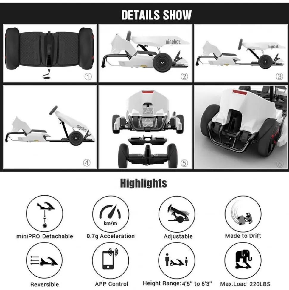 Ninebot Gokart is the first Gokart tested for adrift rates. In addition to the brake pedal, the Ninebot Gokart is equipped with a mechanical handbrake that allows not only to stop the vehicle abruptly, but even to drift. The more you run, the more you can challenge yourself. Enjoy the race with initial acceleration and sprint from 0 to 20 km / h in a few seconds. The adjustable frame and wheels various driving sizes from 130 to 190 cm and a maximum load of 100 kg. Use the Segway-Ninebot App to connect your smartphone with your vehicle to measure your performance, driving mode and use many other features.