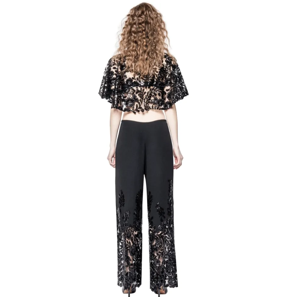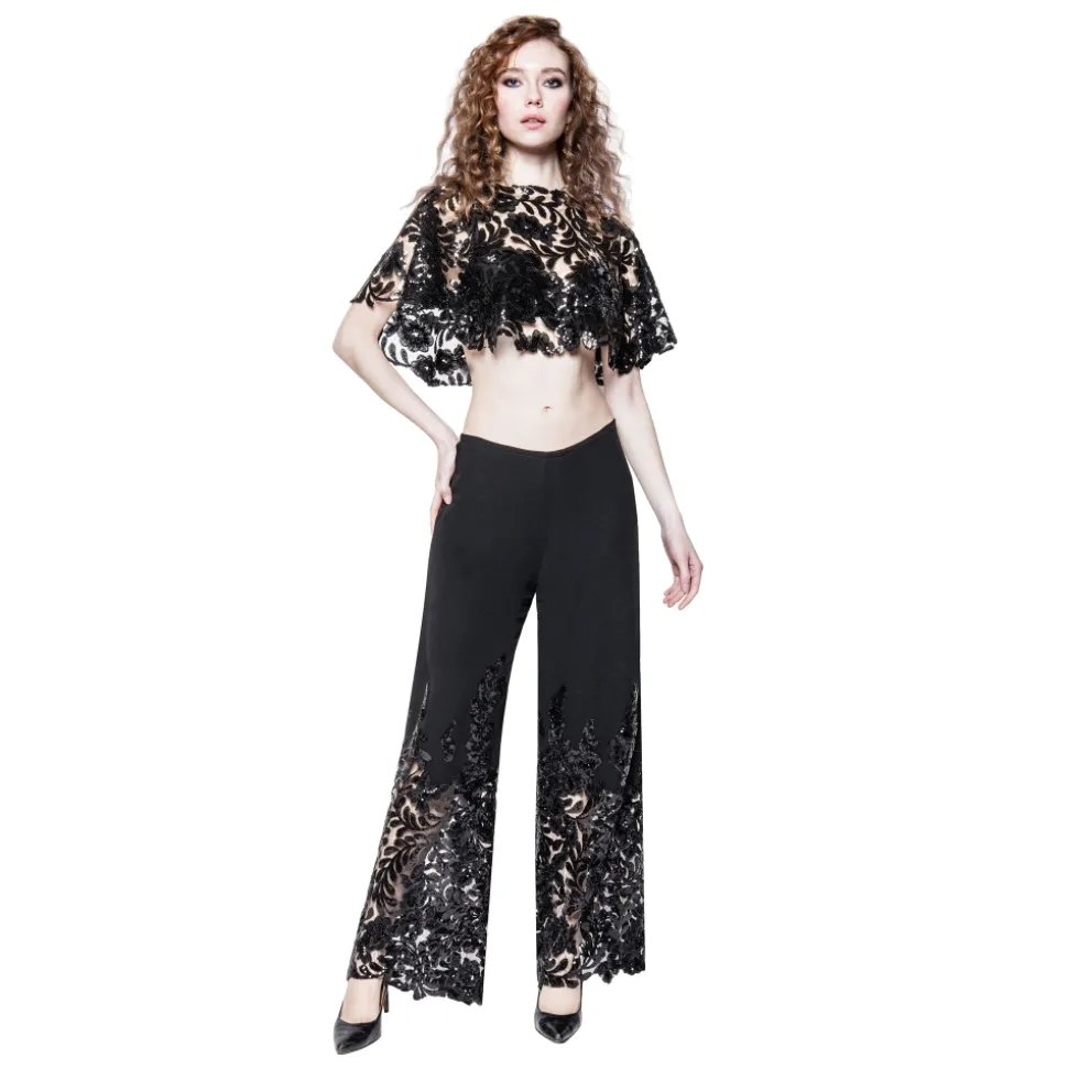 The Seventies style is revisited in the Atelier, with a hand embroidered, fringed gilet. The cady extends to structure the pants which then merges with knee-high lace, creating an elegantly transparent effect at the bottom.