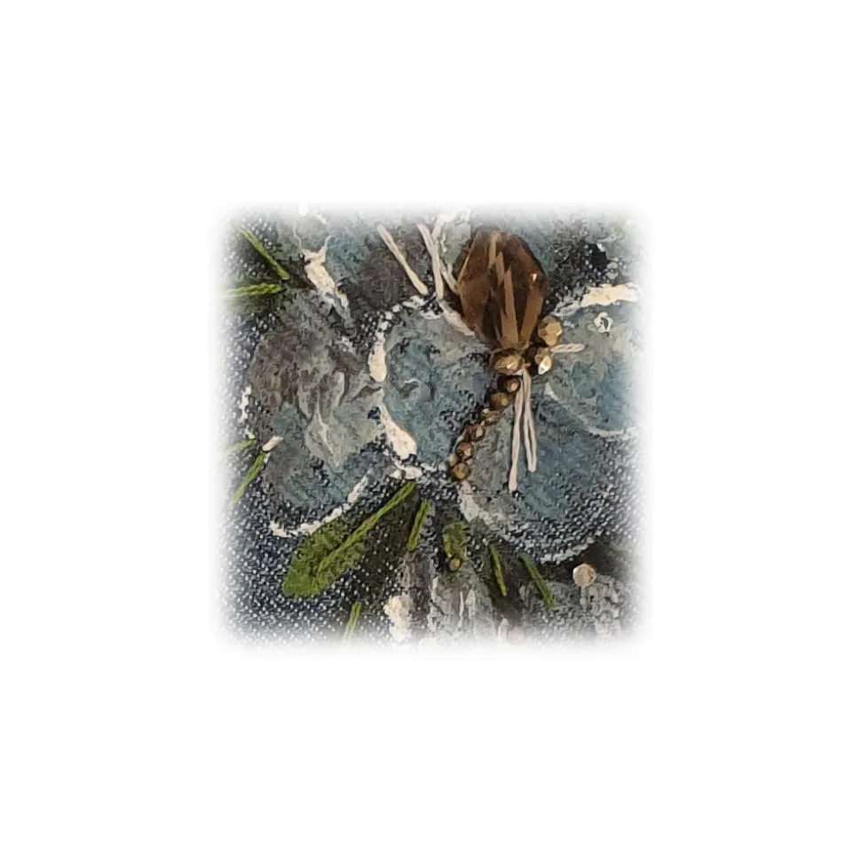 The denim-mixed-with-satin cotton is transformed into a structured Seventies styled, high waist, flared jeans. The clothing item is bleached with silver, hand embroidered and, last but not least, adorned with semi-precious stones that reflect the floral patterns along the pans: citrine, amethysts, tourmaline and acquamarine.
