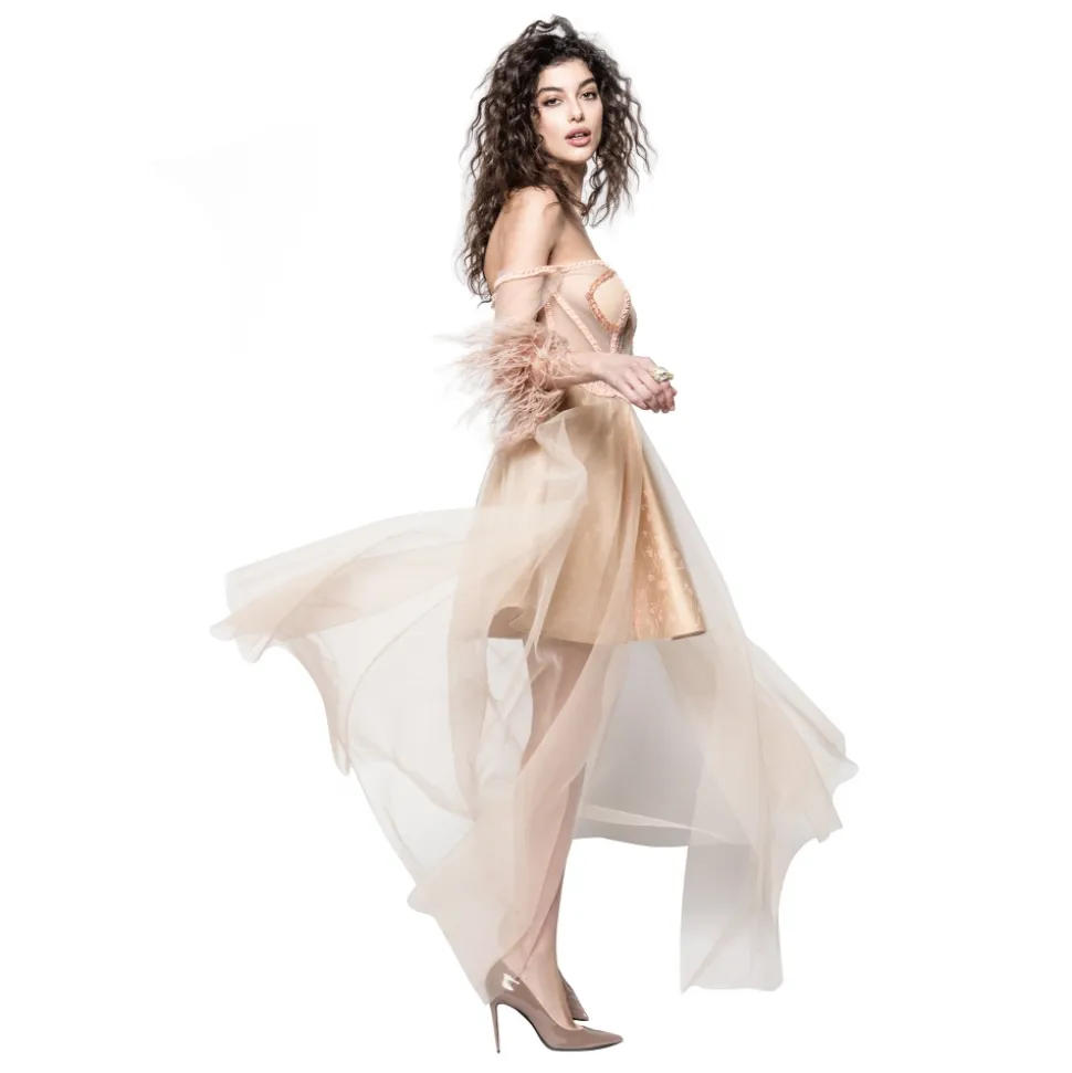 A transparent bodice leaves the last word to the power of construction: splints with embroidered bands create a light and sensual couture. The three-quarter sleeves are topped off with ostrich feathers. The tulle is accompanied by a hand-painted lining and bands of embroidered patterns.