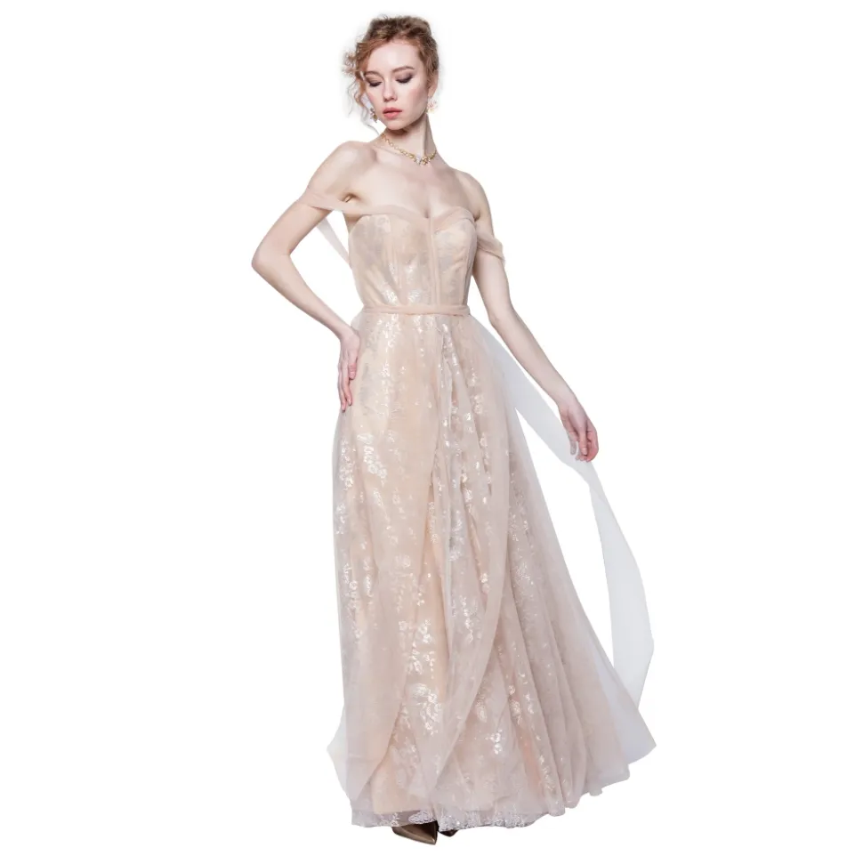 Tulle and light lace lamè effect give life to the main structure of the dress with the sweetheart neckline, decorated with a moulage-made drape, all exclusively hand made. Tulle bands fluctuate from the corsage to the skirt, topped by the light bow that adorns the back of the waistline.