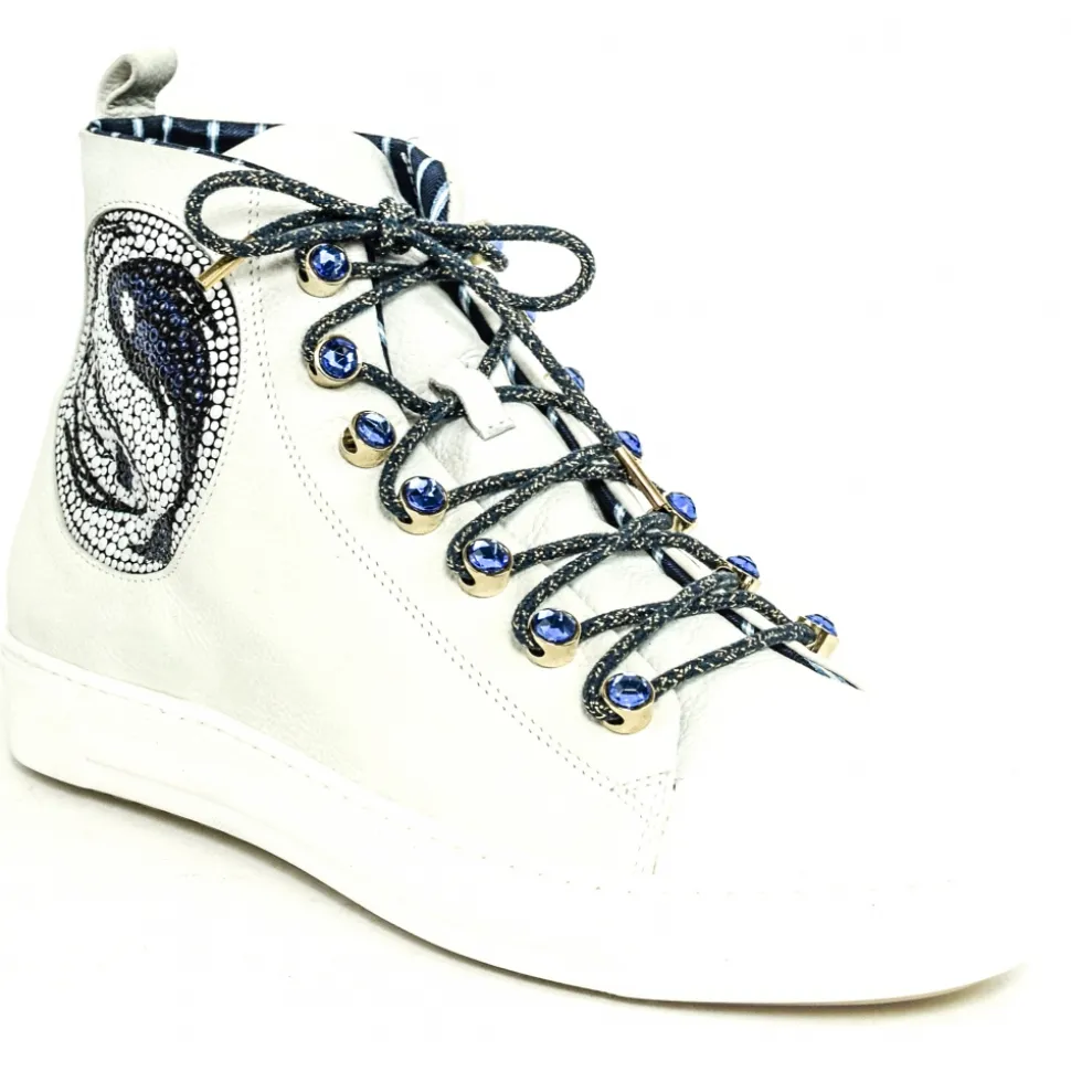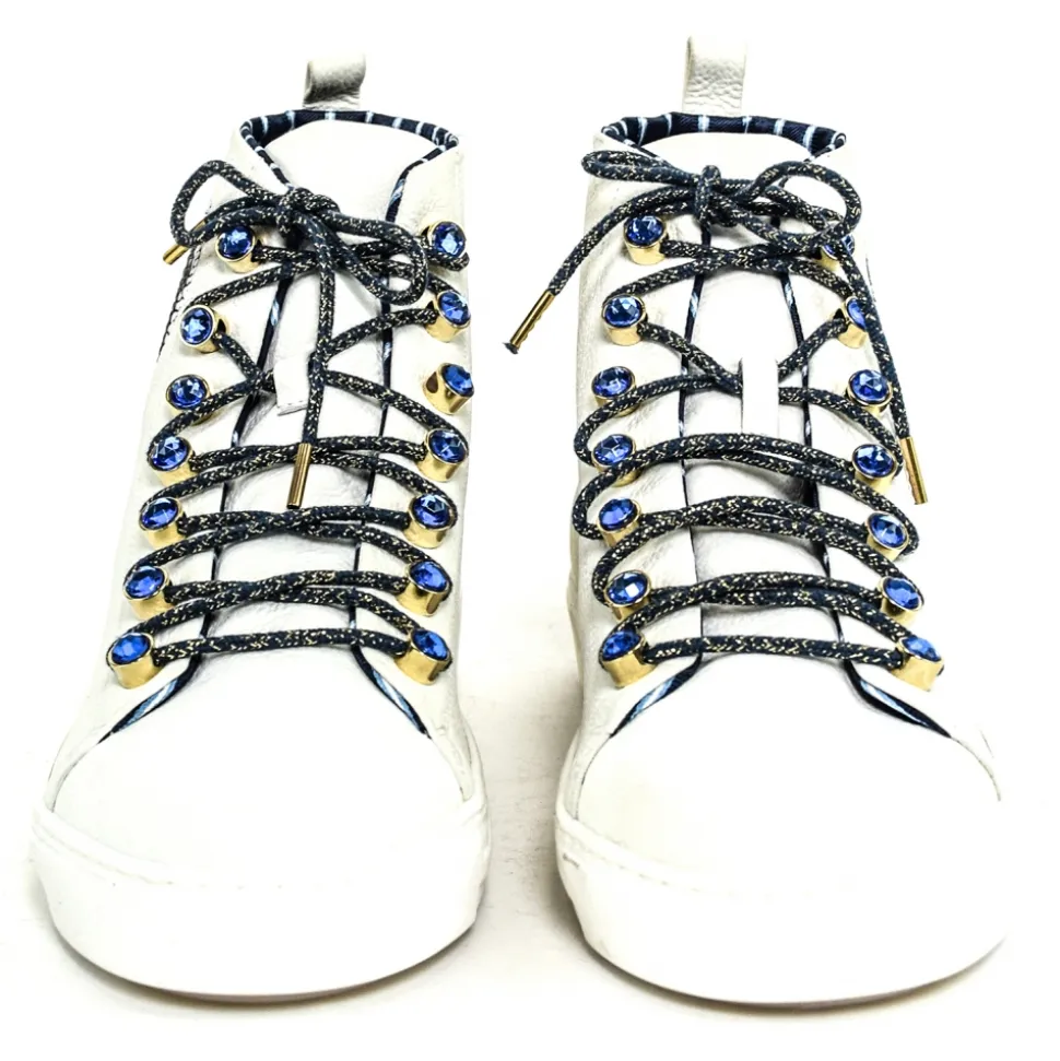 Sneakers made of calf leather with nabuk effect color White with Yin&Yang moeve printed on white strass, satin lining styled with blue stripes, eyelets with areficial stones color Blue, white rubber soles. All materials and produceon: Italy.