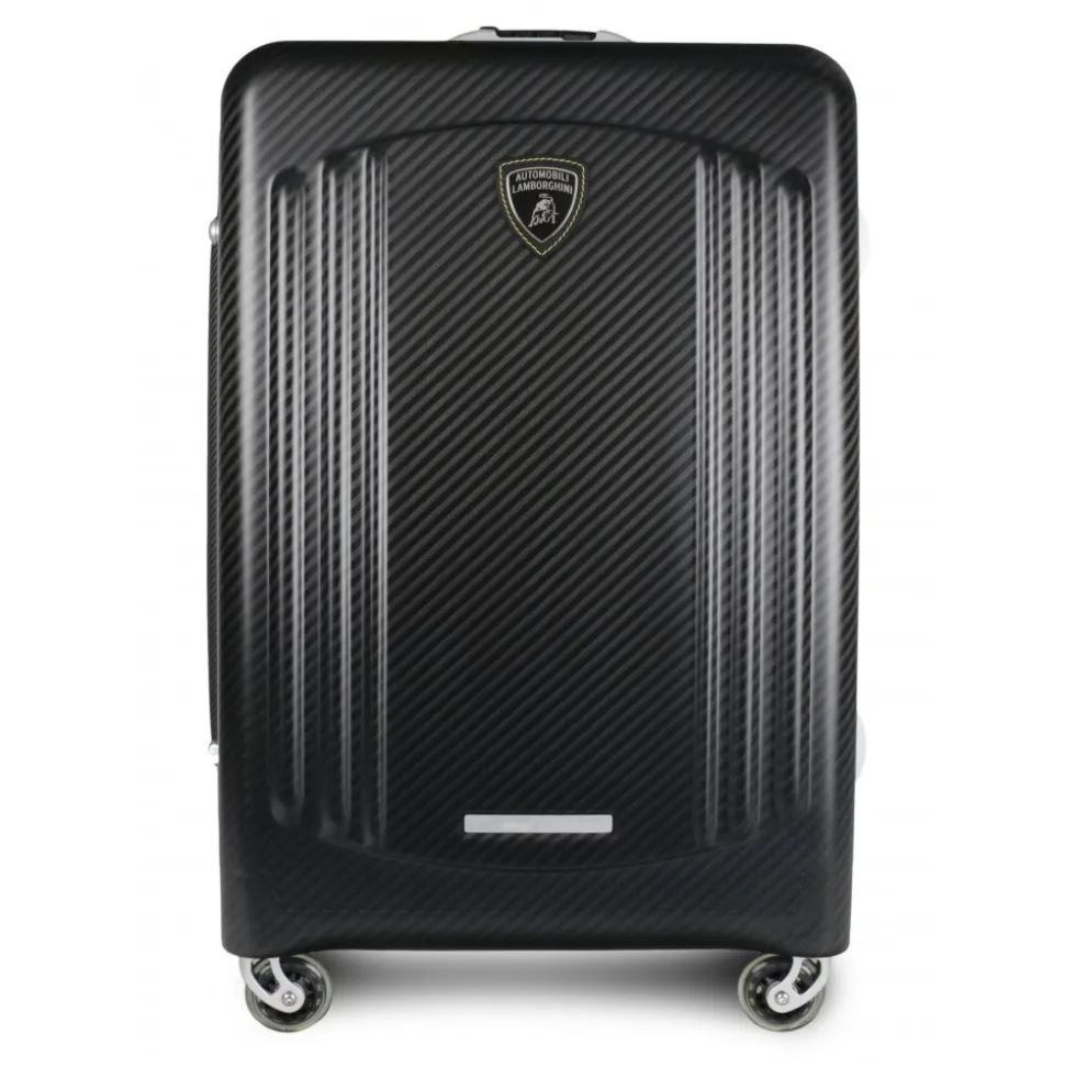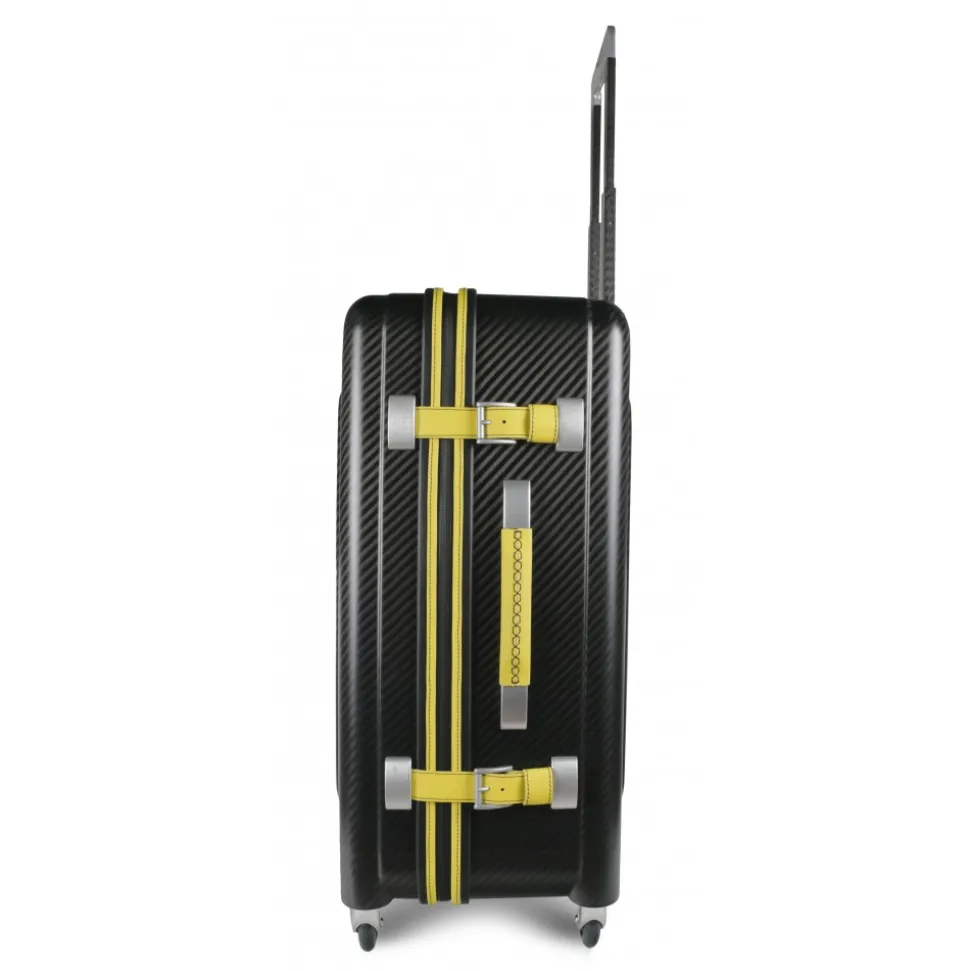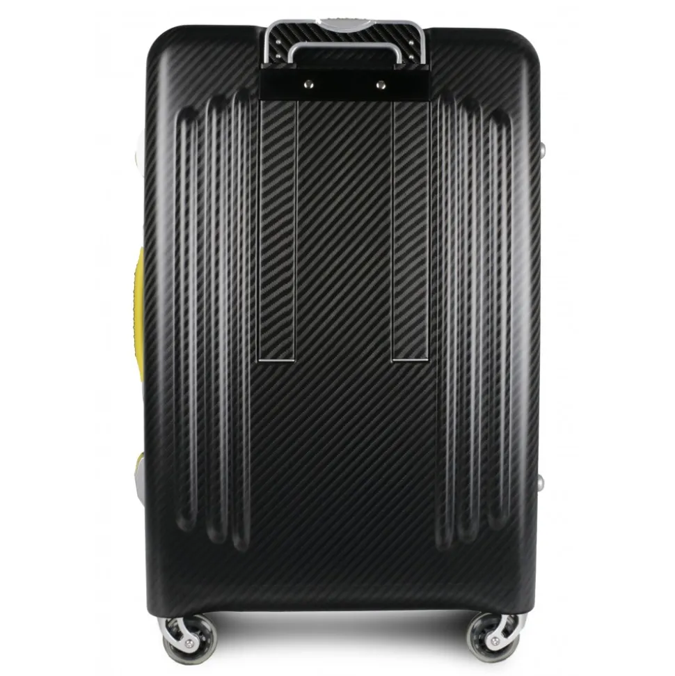 Carbon Fibre Trolley Glacies, forged in autoclave with zipper on top and aluminium details and two leather strap buckles. A co-branding between TecknoMonster and Automobili Lamborghini.