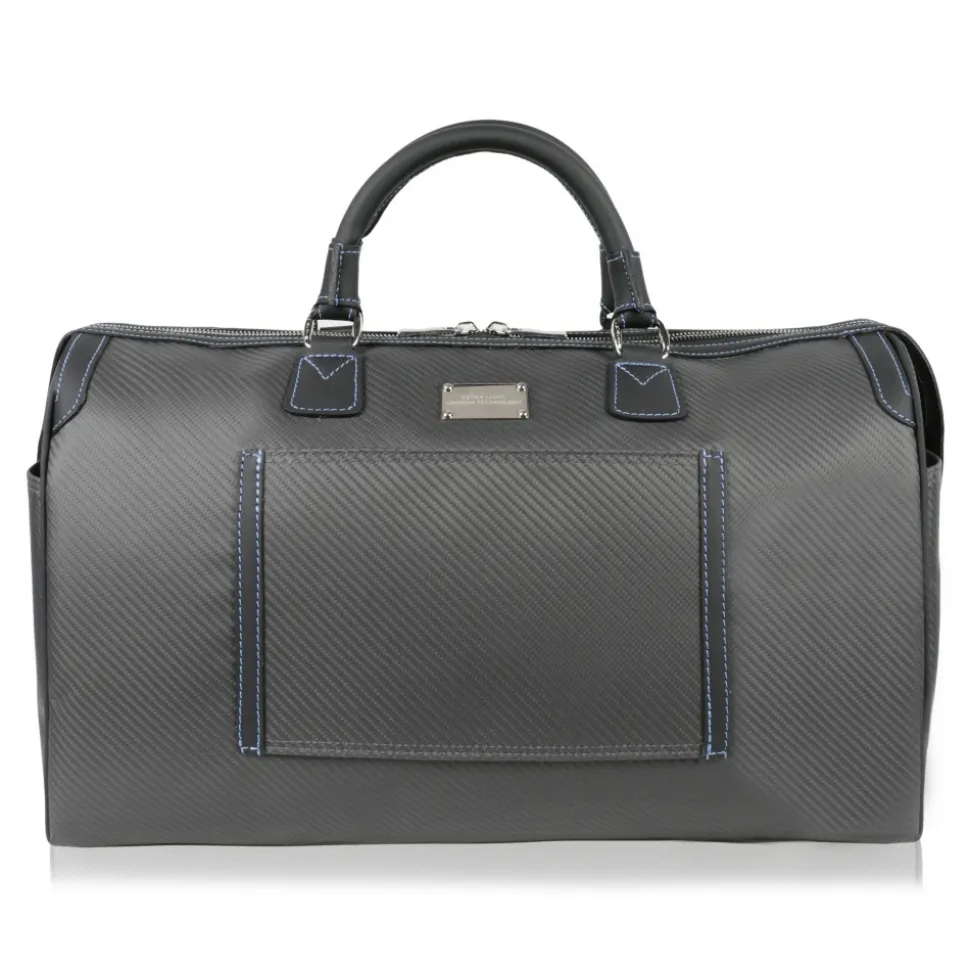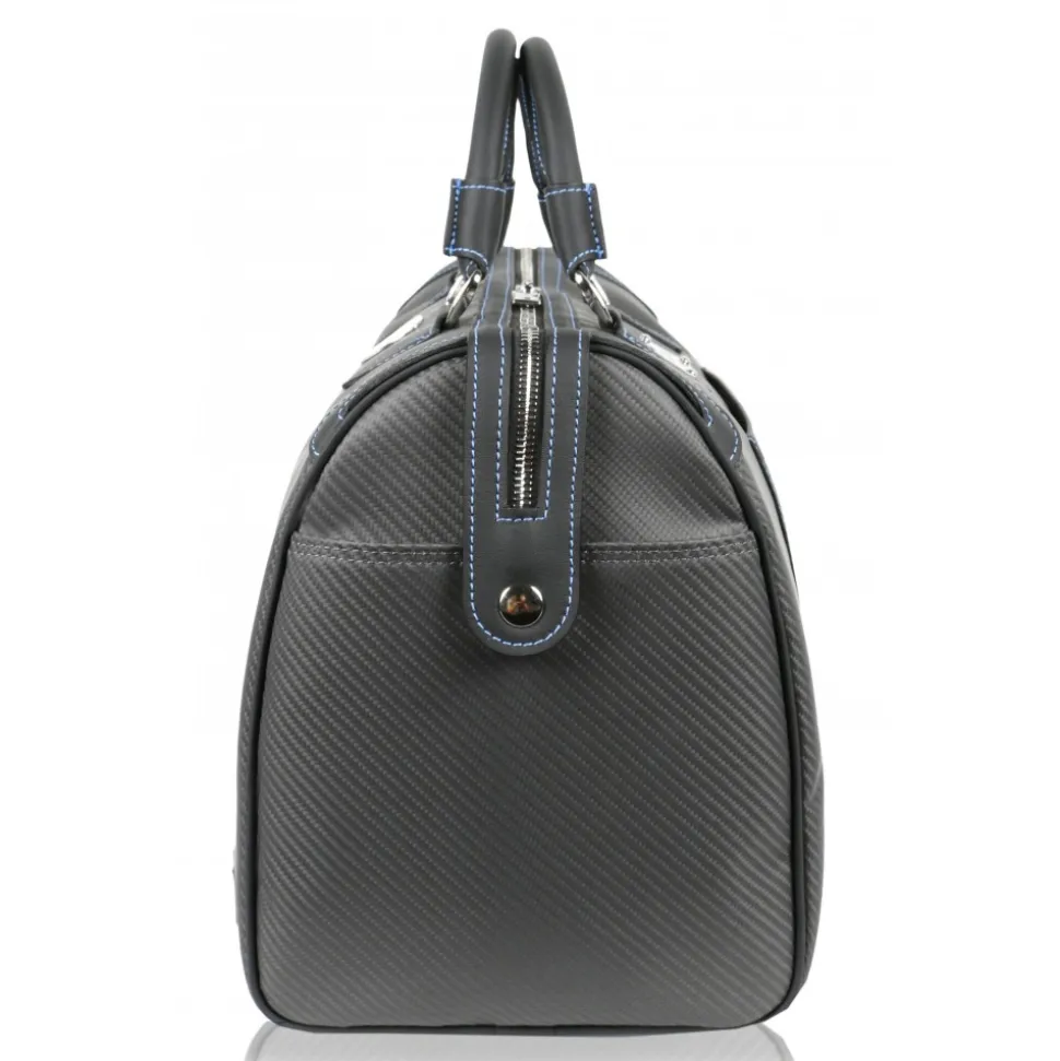 TecknoMonster and Automobili Lamborghini co-branding Ultralight Boston Bag in Carbon Fibre Nix. Car leather is used for handle and details which come in black colour with blue stitchings.