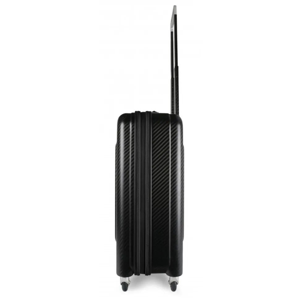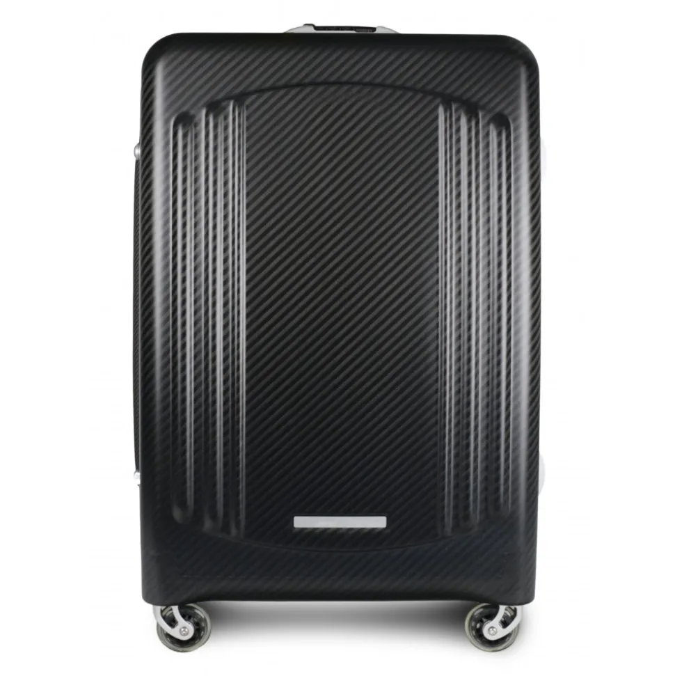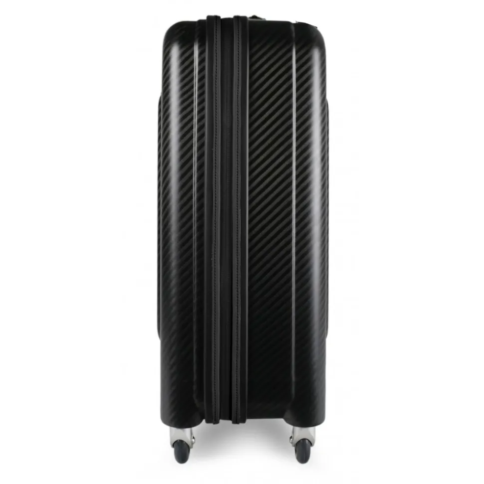 Carbon Fibre Trolley Glacies, forged in autoclave with zipper on top and aluminium details and two leather strap buckles.
