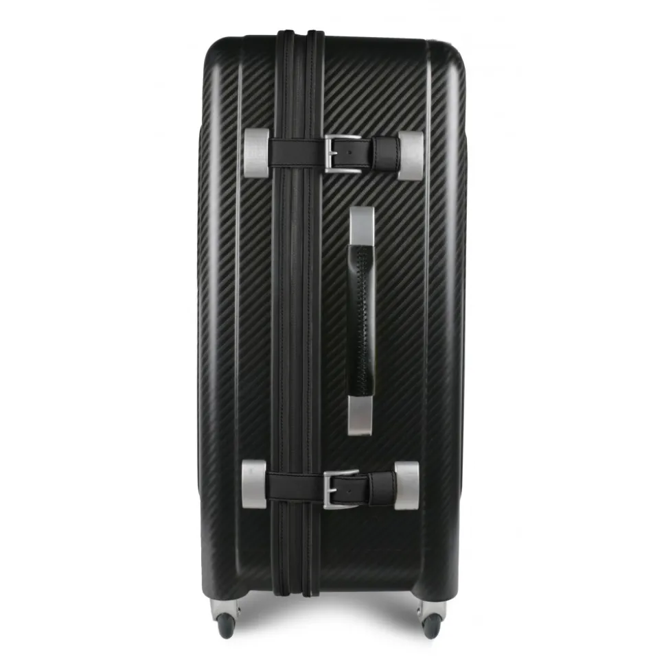 Carbon Fibre Trolley Glacies, forged in autoclave with zipper on top and aluminium details and two leather strap buckles.