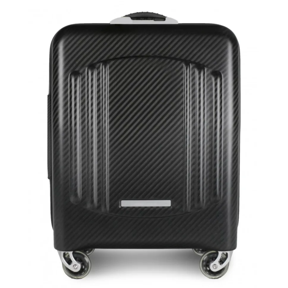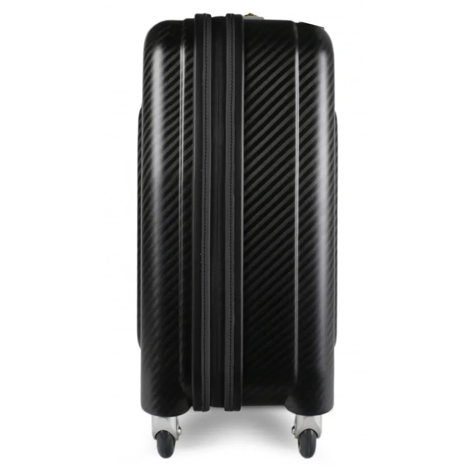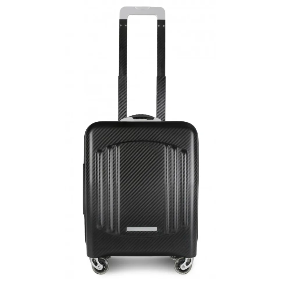 Carbon Fibre Trolley Glacies, forged in autoclave with zipper on top and aluminium details and two leather strap buckles.