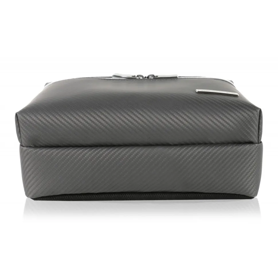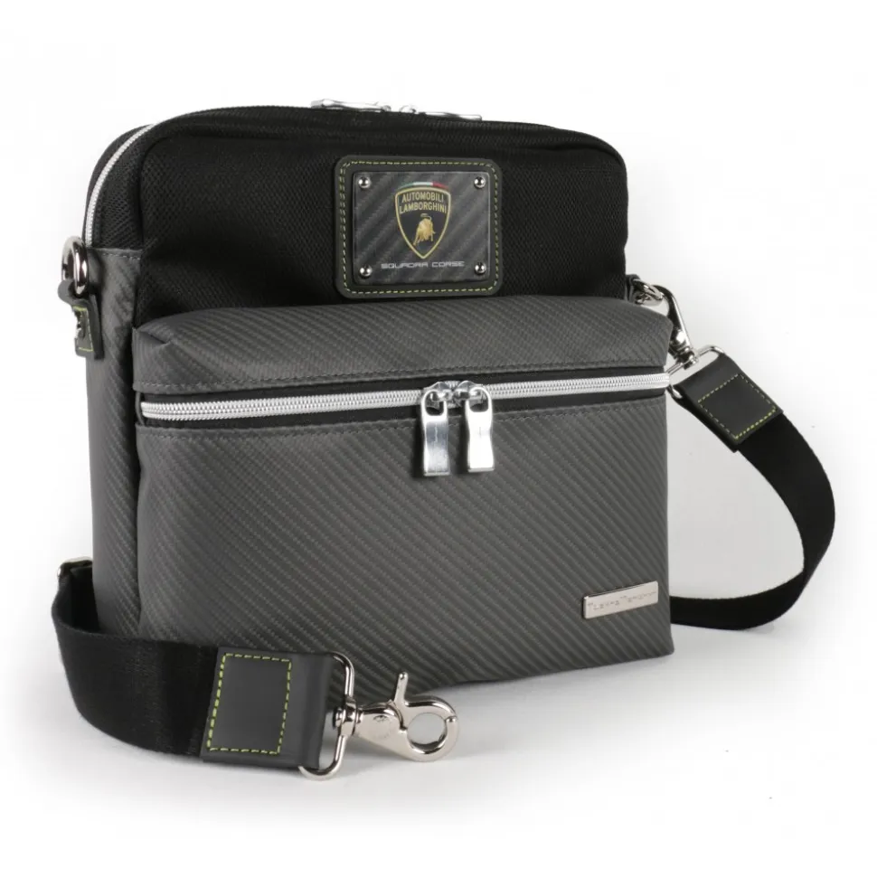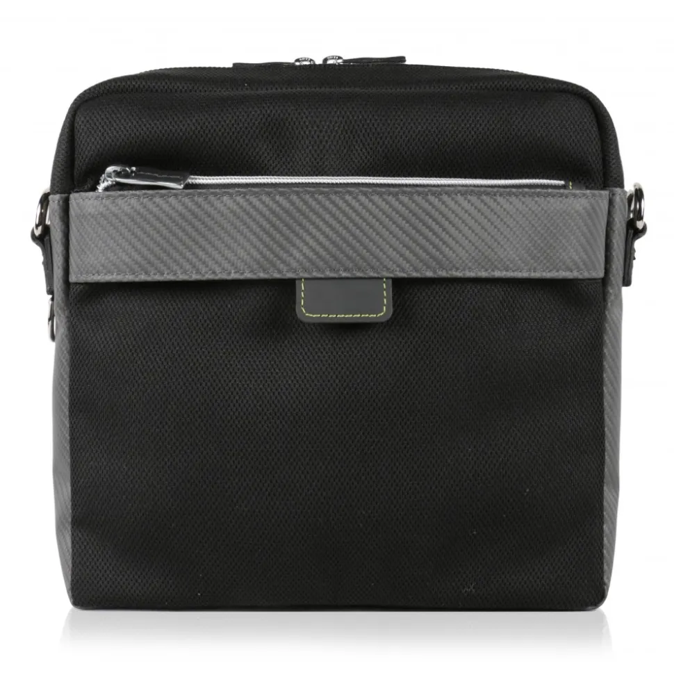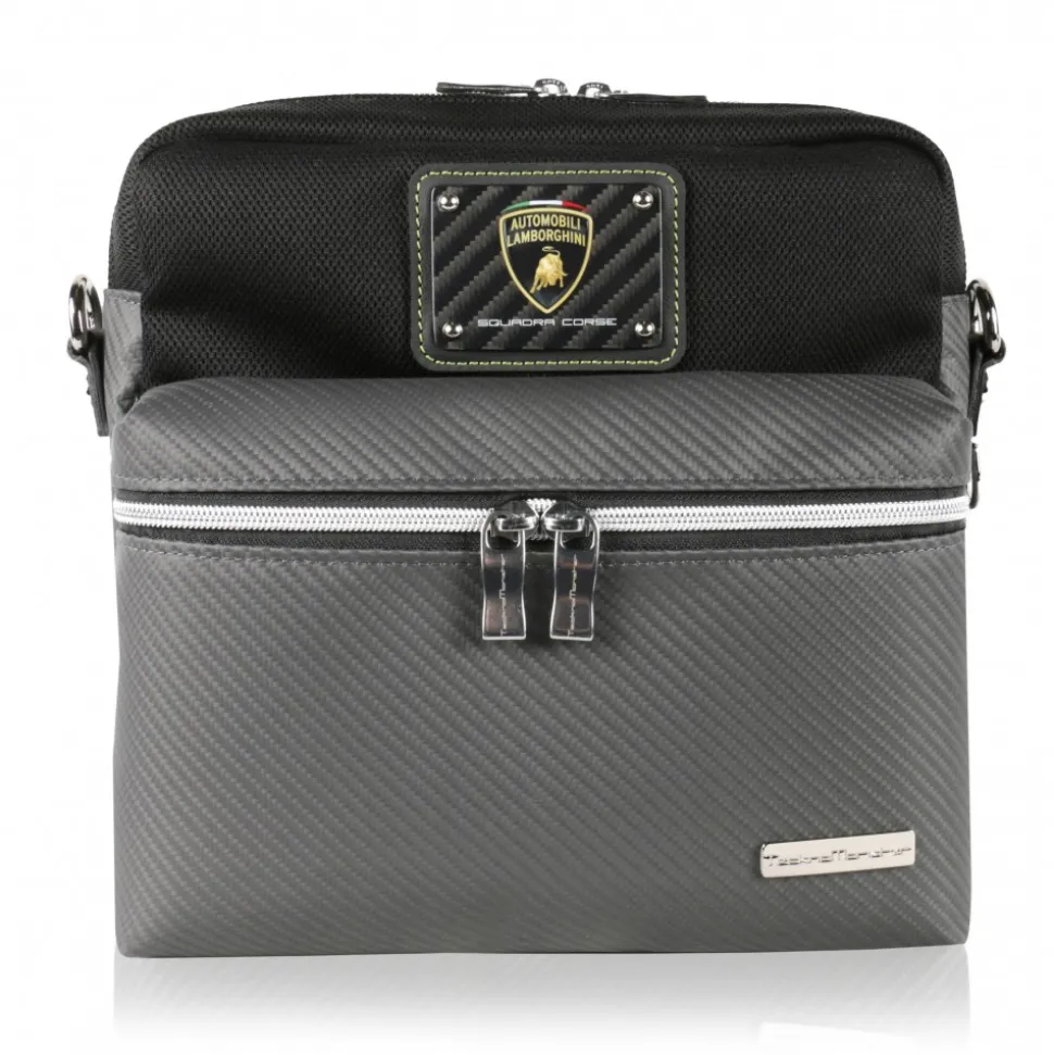 TecknoMonster and Lamborghini Squadra Corse co-branding shoulder bag made of Carbon Fibre Nix and Black Technical Fabric. The leather used for the finishings is the same for cars whilst the seams are green. The logo is printed on Carbon Fibre Glacies.