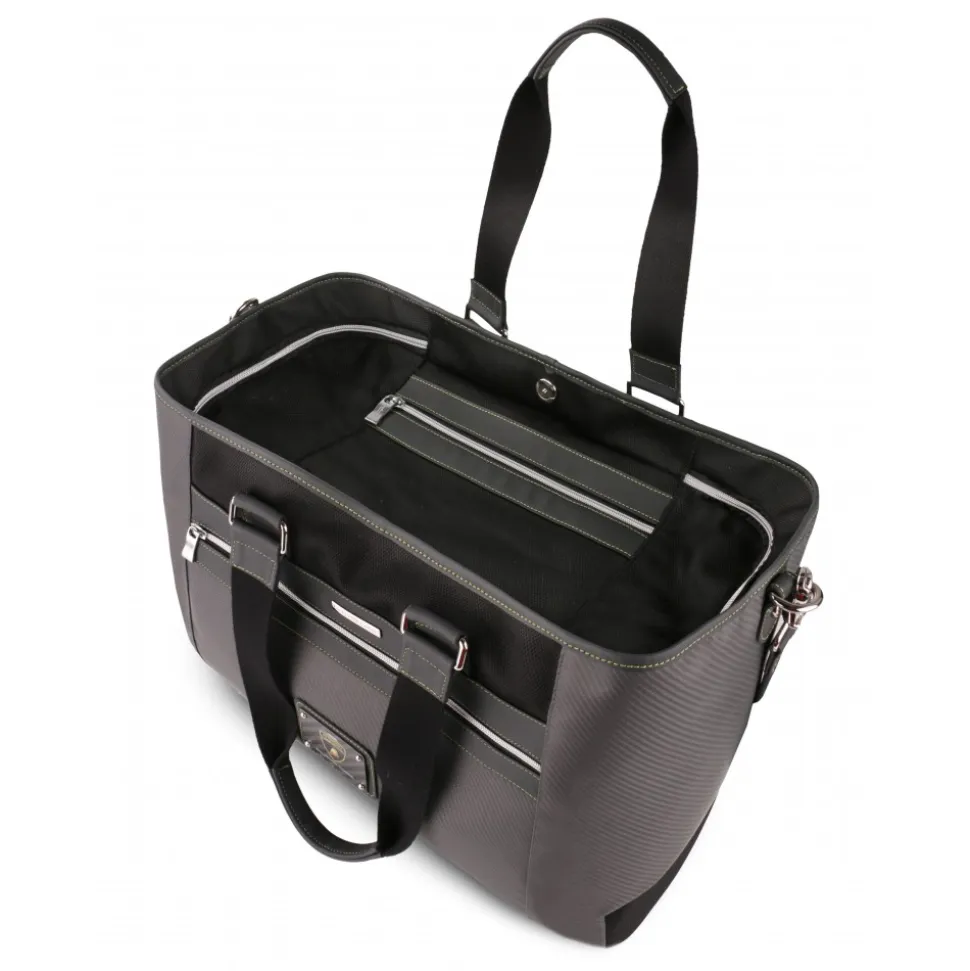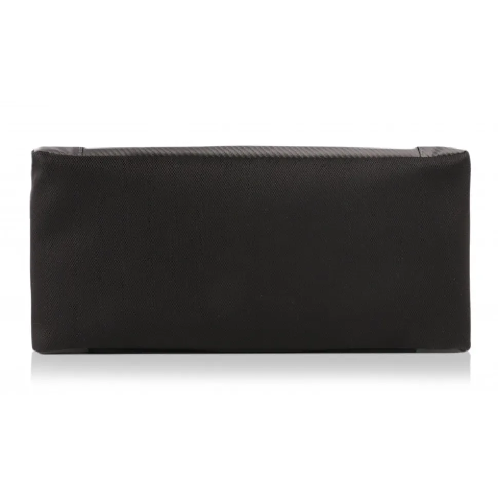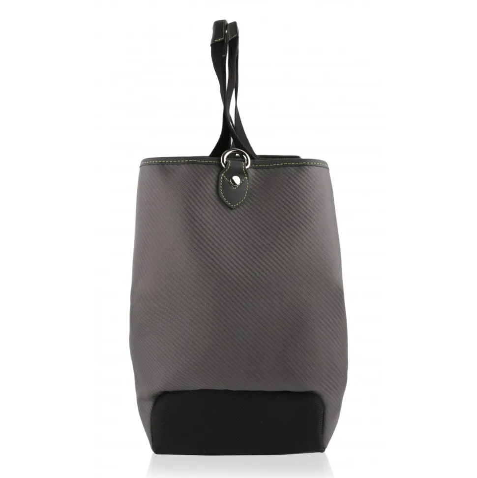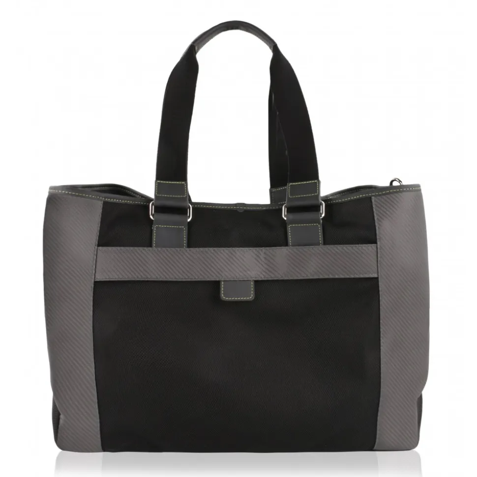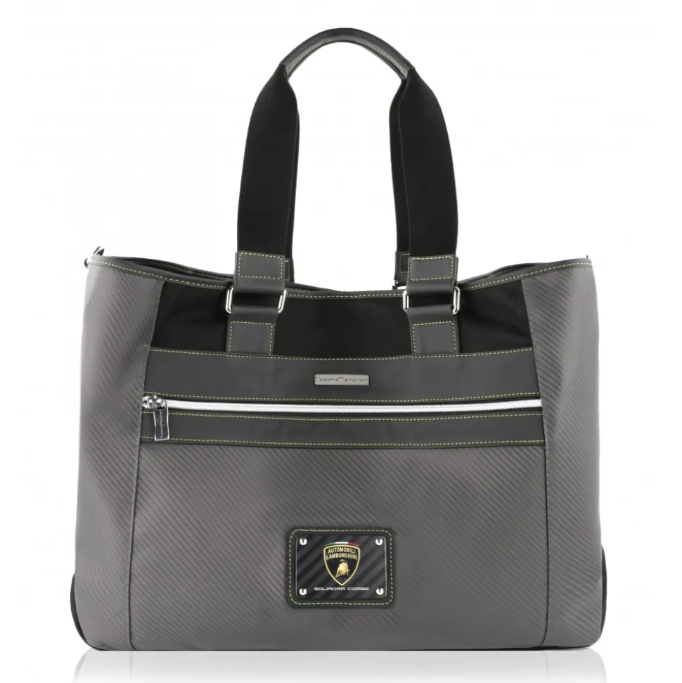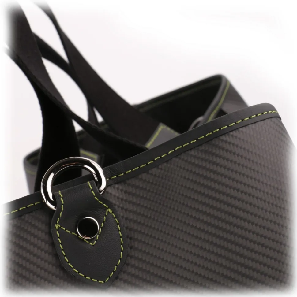 TecknoMonster co-branding bag and Lamborghini Squadra Corse made of Nix Carbon Fibre and Black Technical Fabric. The leather used for the finishes is the same for cars whilst the seams are green. The logo is printed on Carbon Fibre Glacies.