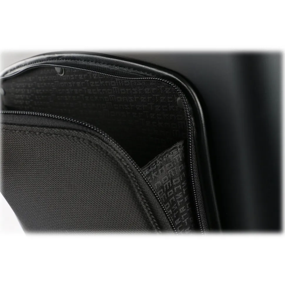 Teck raw military finishing for wheels support, aluminum TSA lock, black aluminum features details, hand-stitched leather handles, front balistic fabric pocket with zip closure.Â