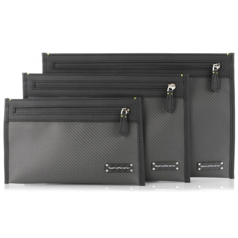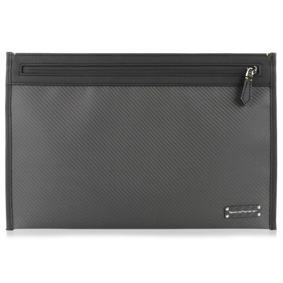Envelope in Carbon Fibre Nix, ultra thin and ultralight. Hand made leather details. Plate logo with Carbon Fibre Glacies.