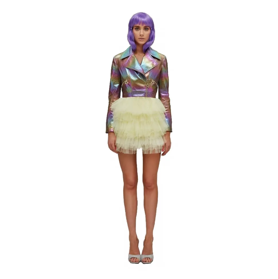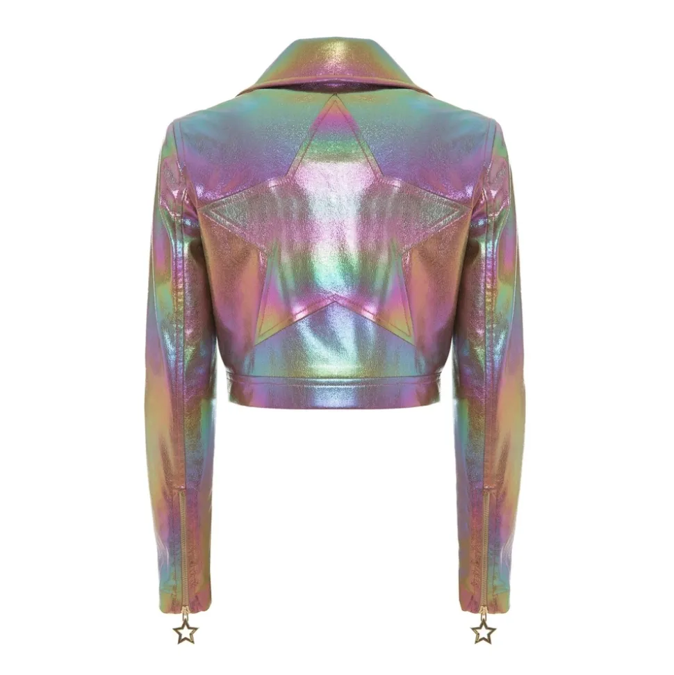 Cropped jacket in metallic eco-leather and star carved on the back. Closure with automatic.