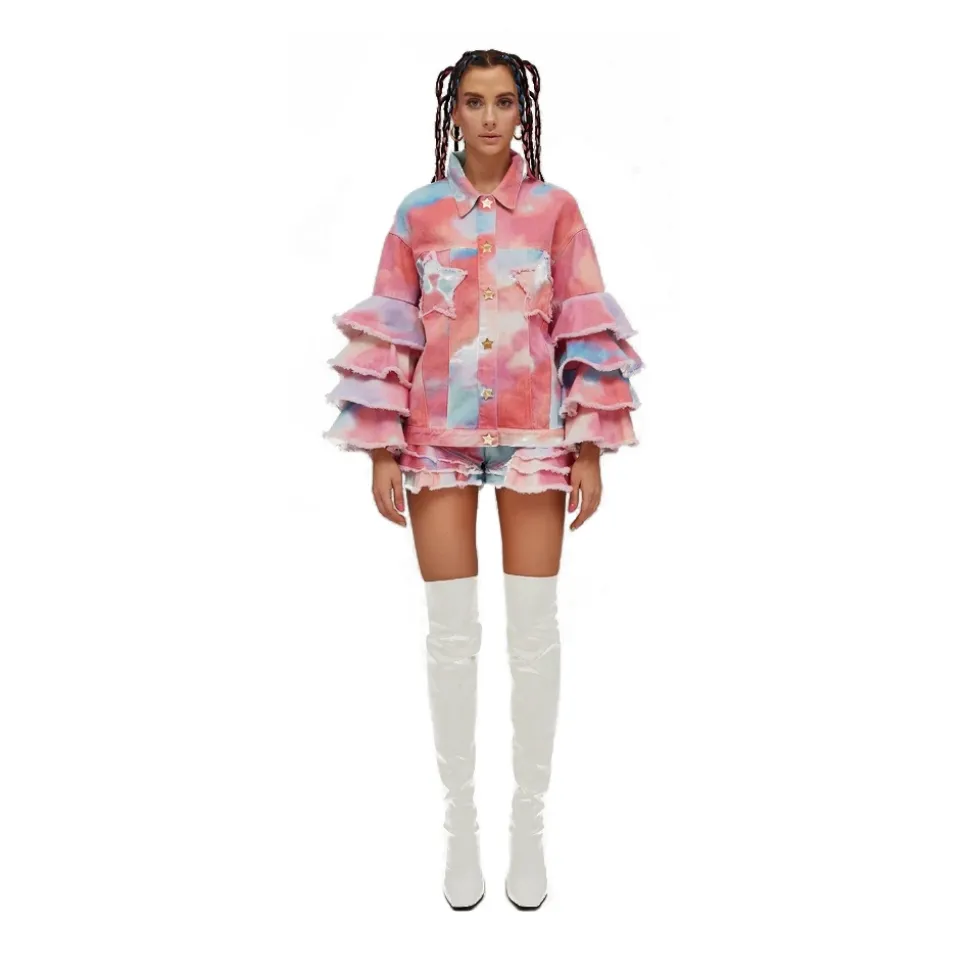 All-over printed denim jacket and raw cut ruffles on the sleeves.