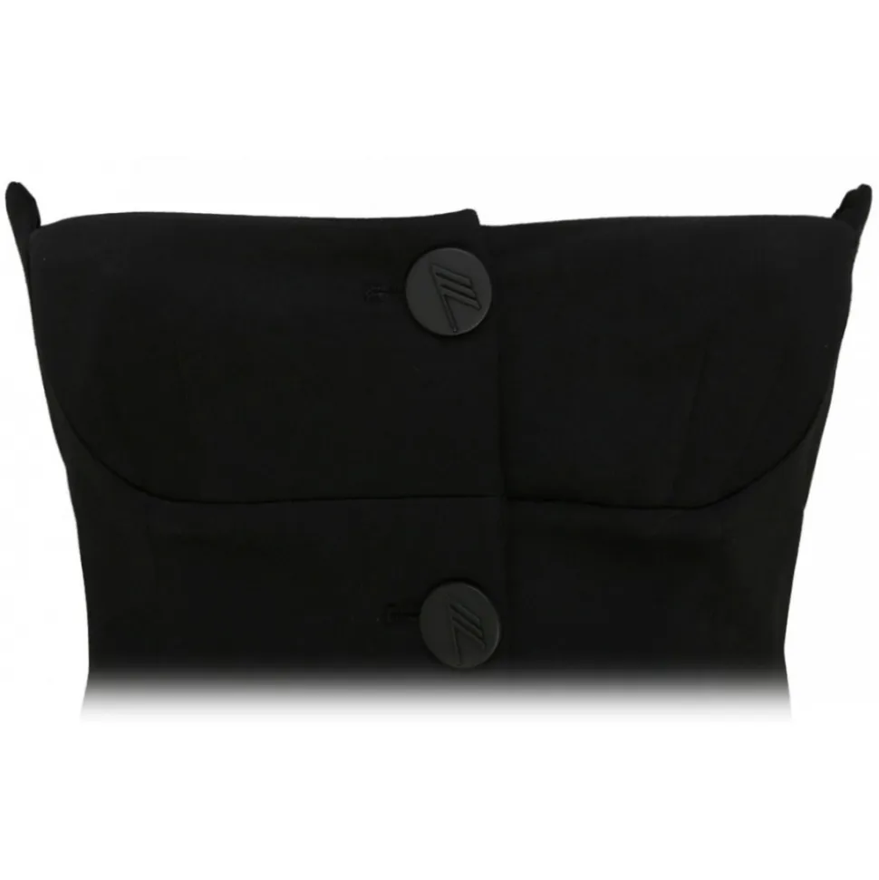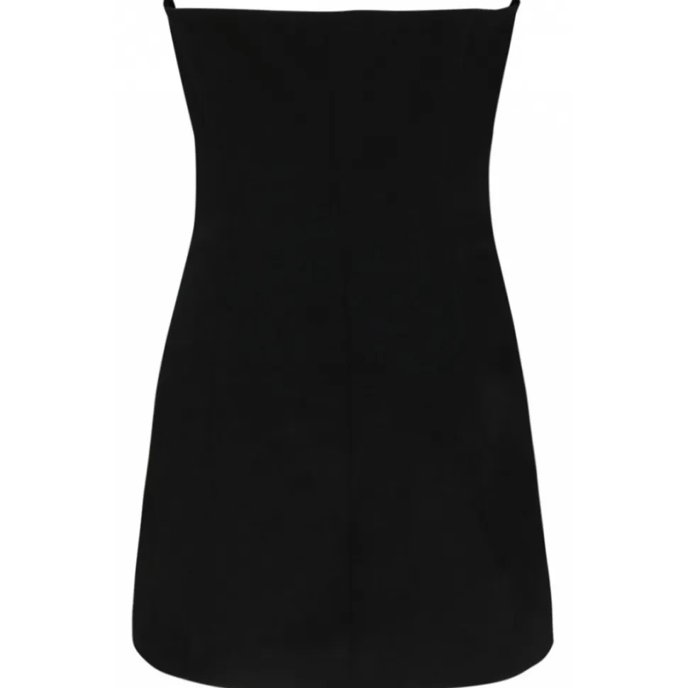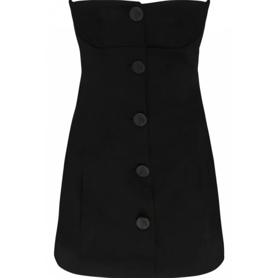 The Attico Black Virgin Wool Asymmetric Buttoned Mini Dress. Black virgin wool mini dress, asymmetric design, strapless, sweetheart neck, front button fastening, thigh length.