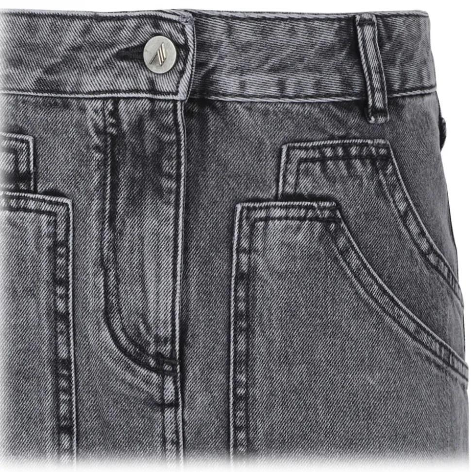 The Attico Black Denim Mini Skirt. Black cotton mini skirt, front button and zip fastening. Belt loops, multiple patch pockets, embroidered logo to the rear.