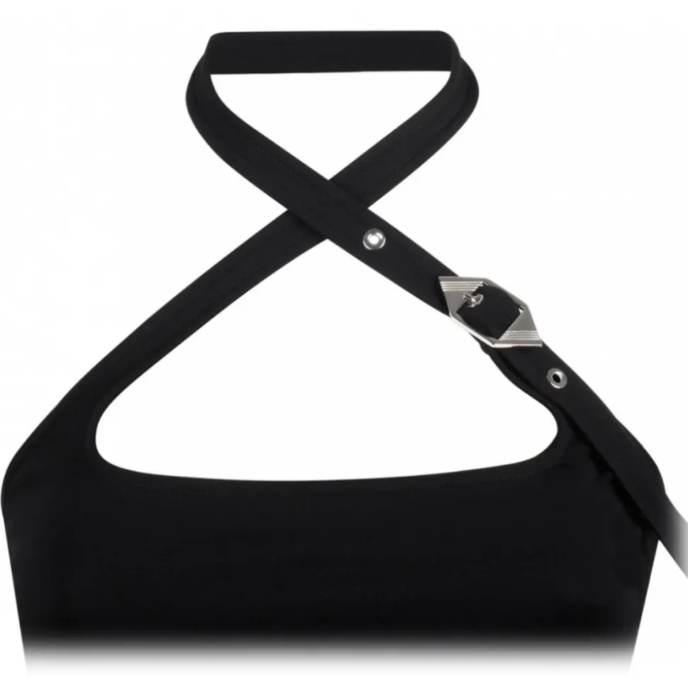 The Attico Black Midi Dress. Black stretch jersey midi dress, crossover halter neck, logo buckle fastening. Concealed rear zip fastening, central rear vent, mid calf length, straight hem.