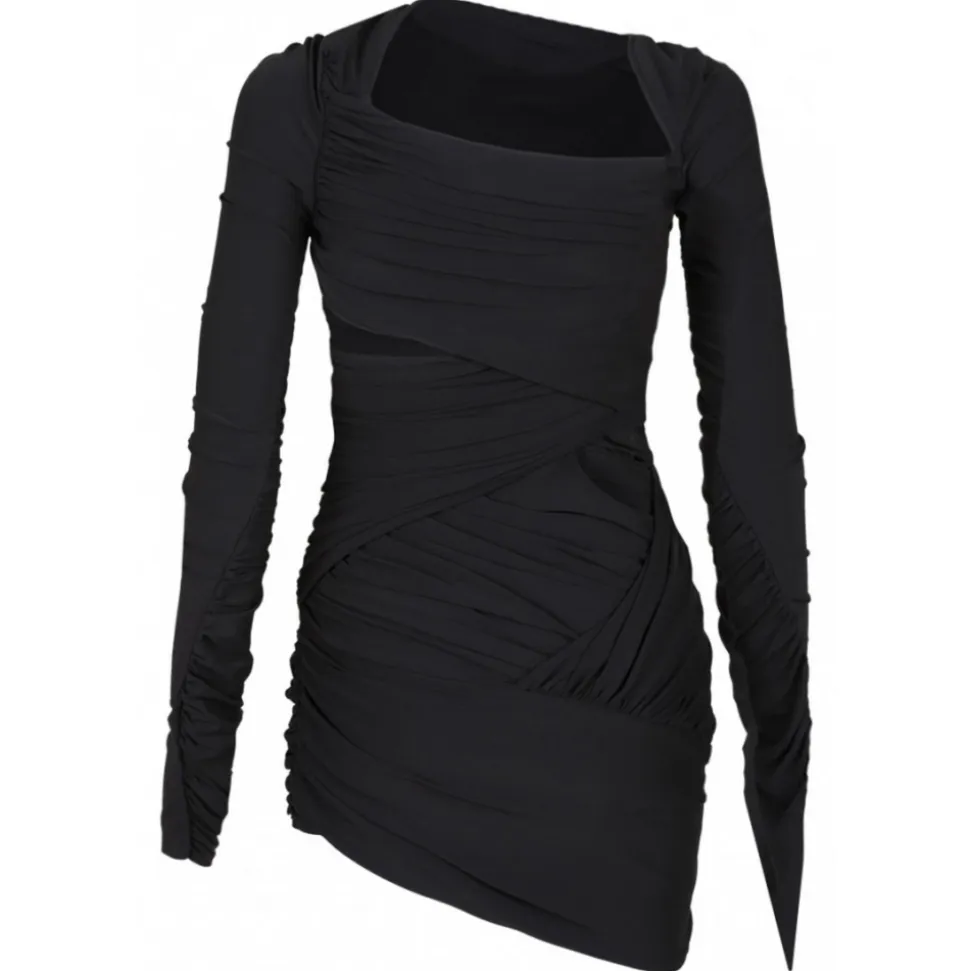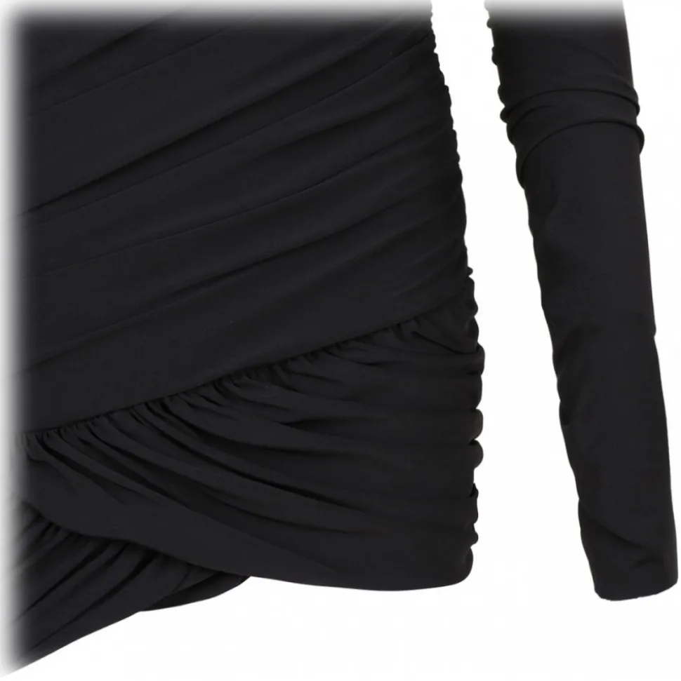 The Attico Black Wrap Mini Dress. Black wrap mini dress, ruched detailing, mock neck, long sleeves. Cut out detailing, thigh length, side zip fastening.