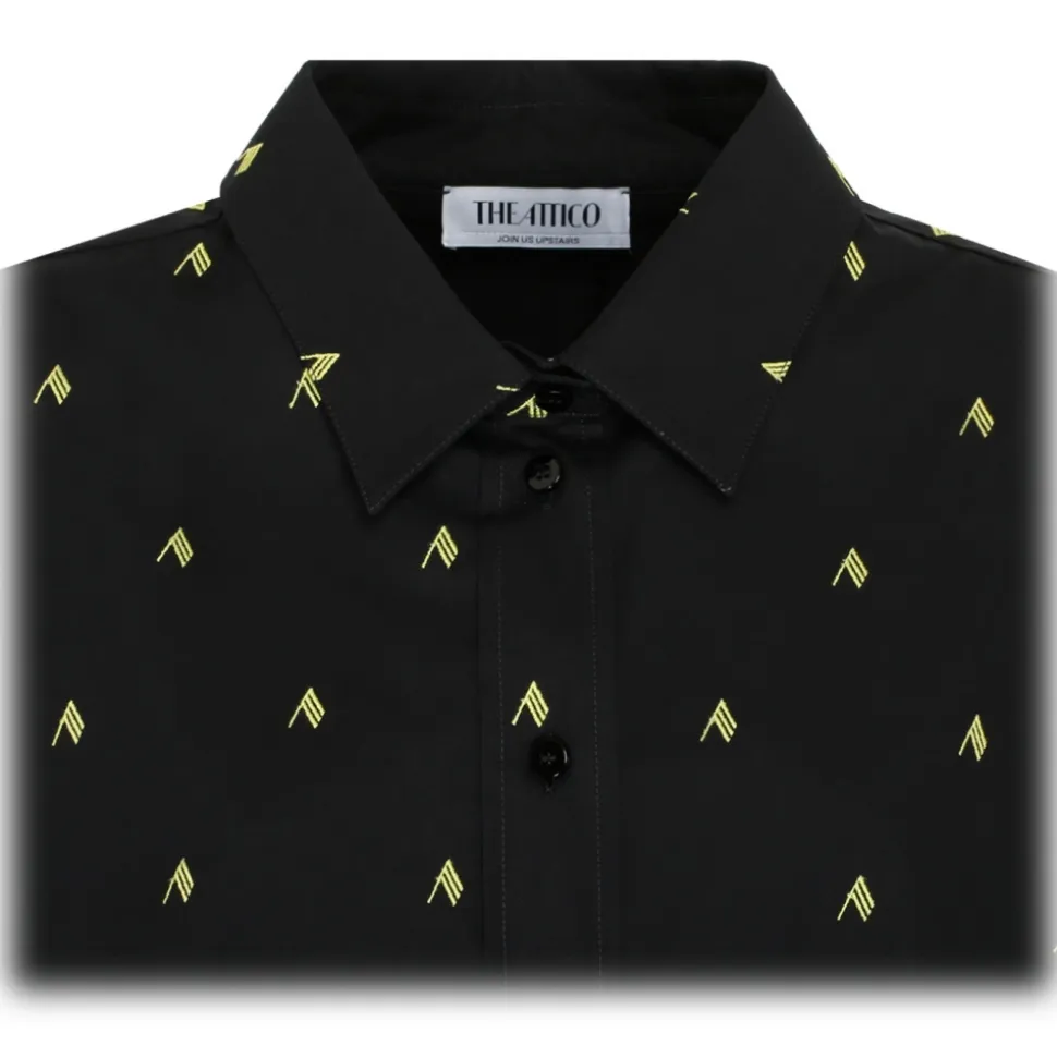 The Attico Black and Yellow Cotton Diana Logo Print Shirt. Black and yellow cotton shirt, all over logo print, oversized silhouette, asymmetric hem. Classic collar, front button fastening, buttons cuffs.